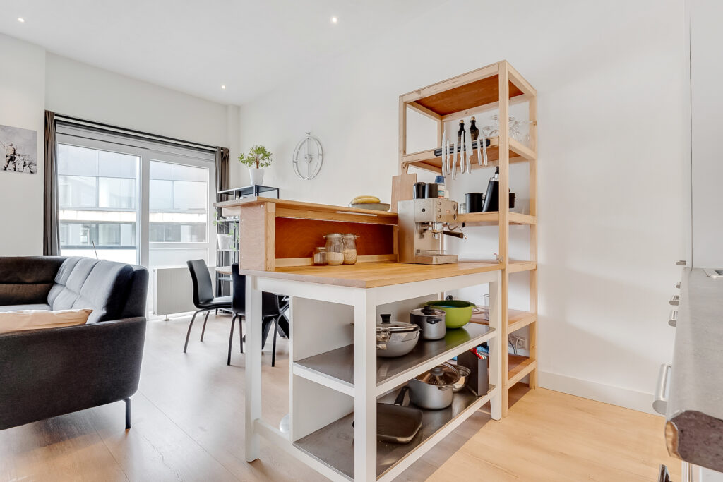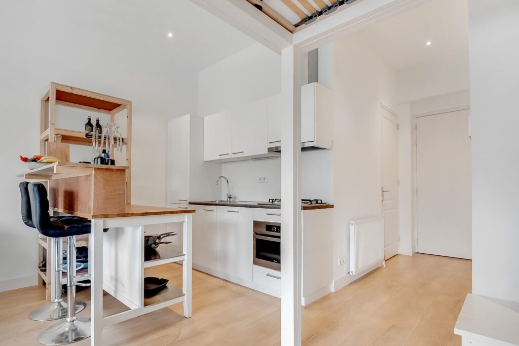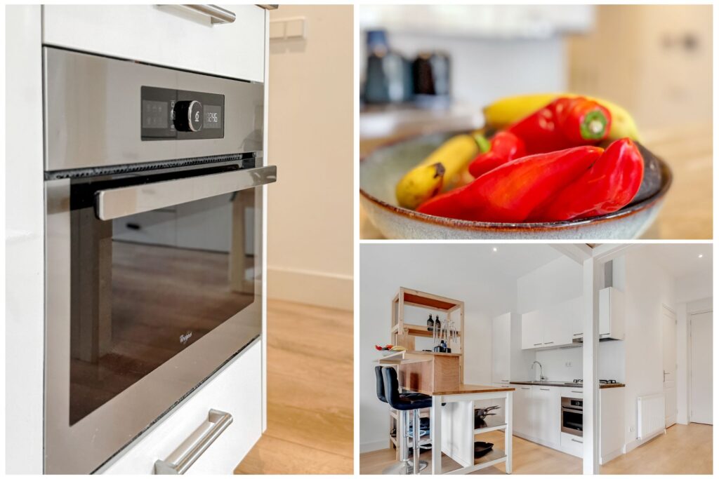 De open keuken heeft een moderne opstelling en is uitgerust met diverse inbouwapparatuur, waaronder een koelkast, vaatwasser, gaskookplaat, afzuigkap en oven.
