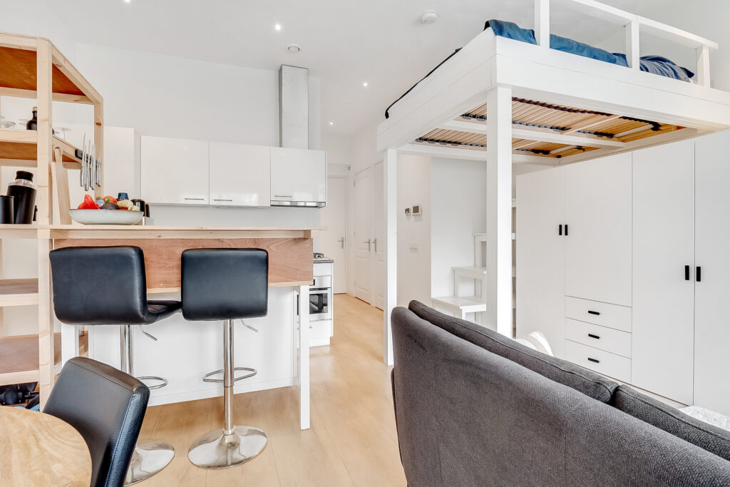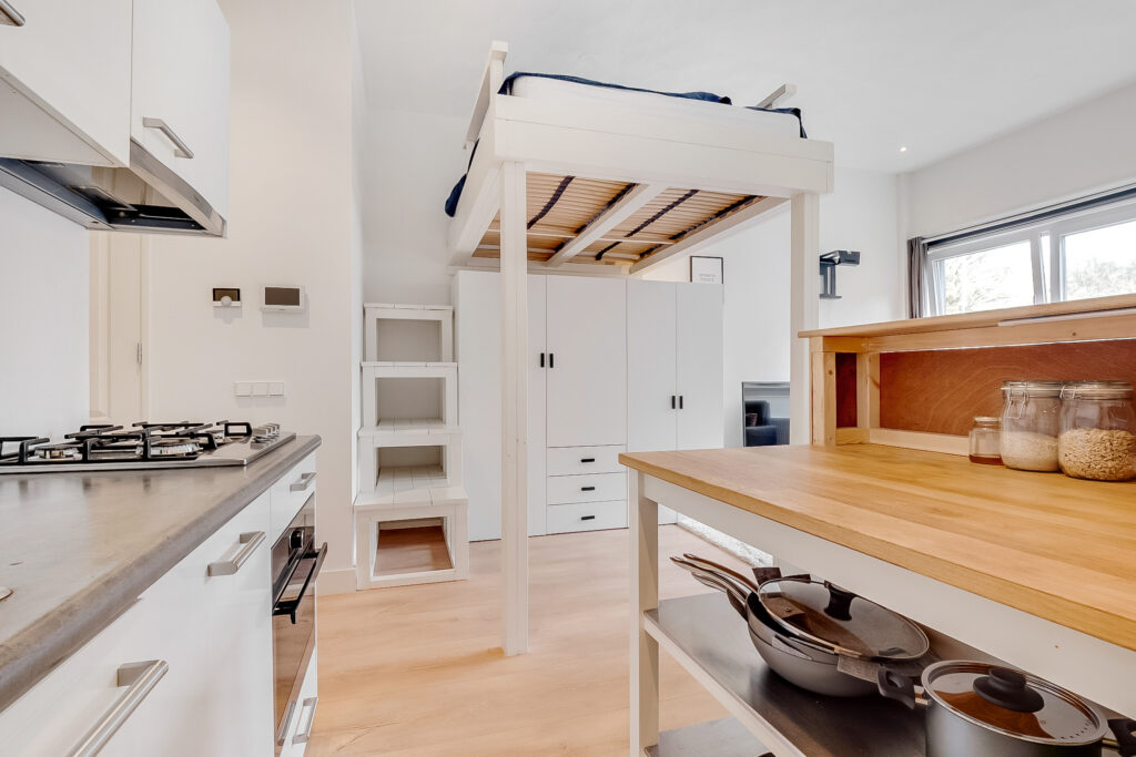Het verhoogde slaapgedeelte dat achterblijft zorgt op een speelse manier voor een optimale benutting van de ruimte.