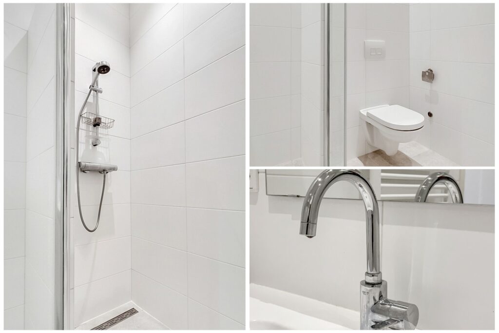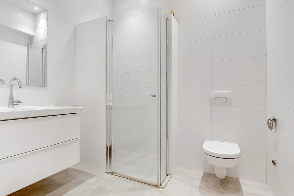 De moderne, geheel betegelde badkamer is voorzien van een douchecabine, wastafelmeubel, hangend toilet en een strak plafond met inbouwspots.