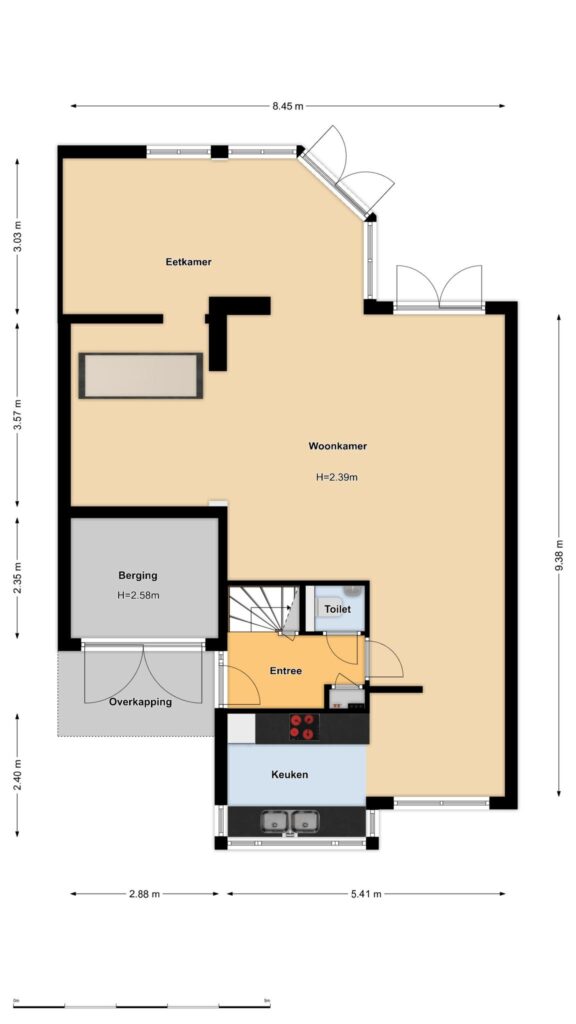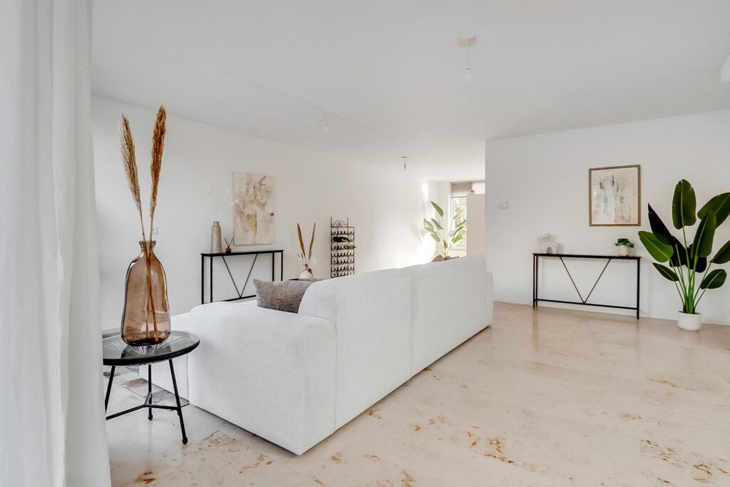 Begane grond: voortuin, entree/hal, toilet met een zwevend Starck toilet en een fonteintje, meterkast en trapopgang naar de 1e verdieping. Ruime, L-vormige (uitgebouwde) living met lichtkoepel en openslaande deuren naar de achtertuin. De begane grond is voorzien van een mooie natuurstenen vloerafwerking met vloerverwarming.