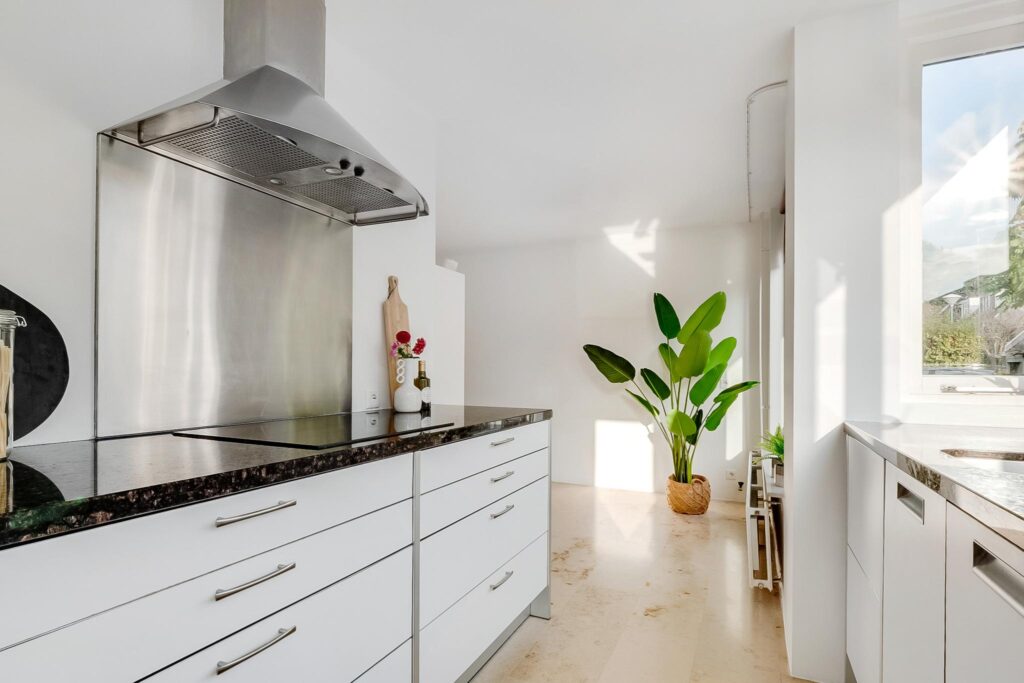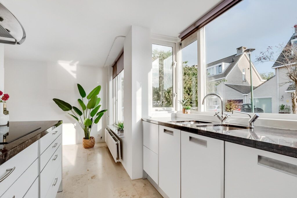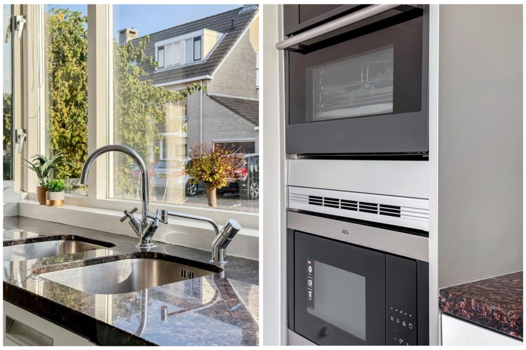 de vele raampartijen zorgen voor een prettige lichtinval. De nette open keuken (Bulthaup design) is gelegen aan de voorzijde van de woning. De keuken met een natuurstenen werkblad is voorzien van de volgende inbouwapparatuur: 4 pits inductie kookunit, afzuigkap (RVS schouwmodel), vaatwasmachine, stoomoven, combimagnetron, dubbele spoelbak, quooker en een close-in boiler.