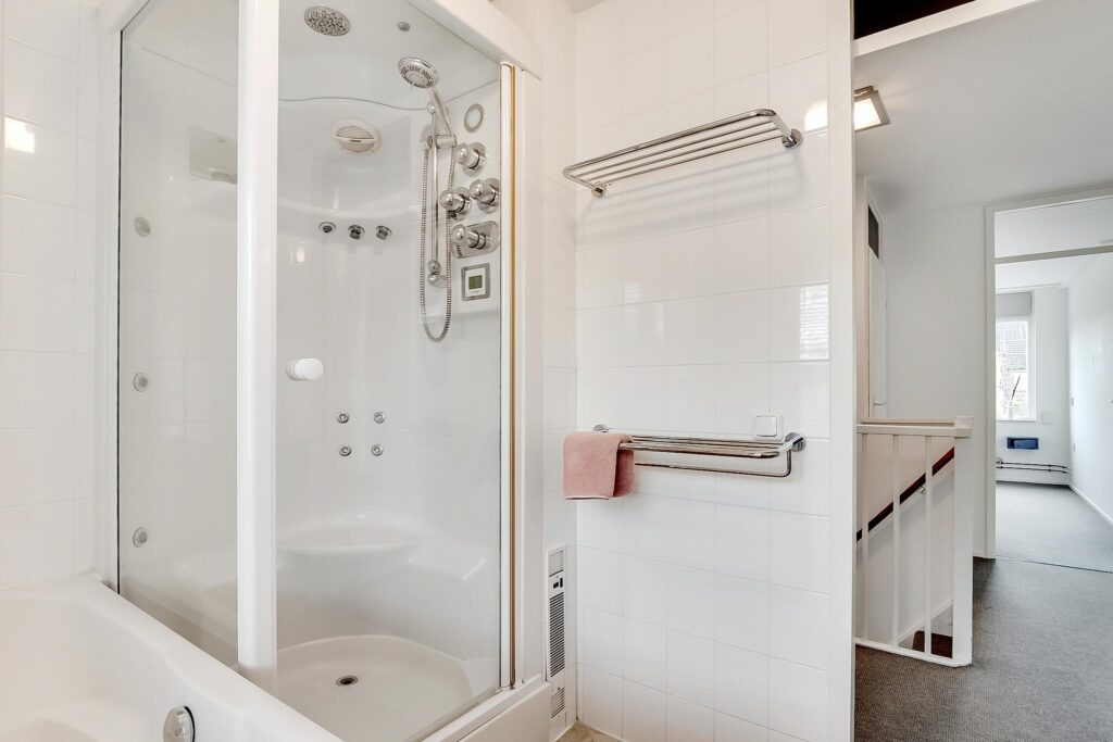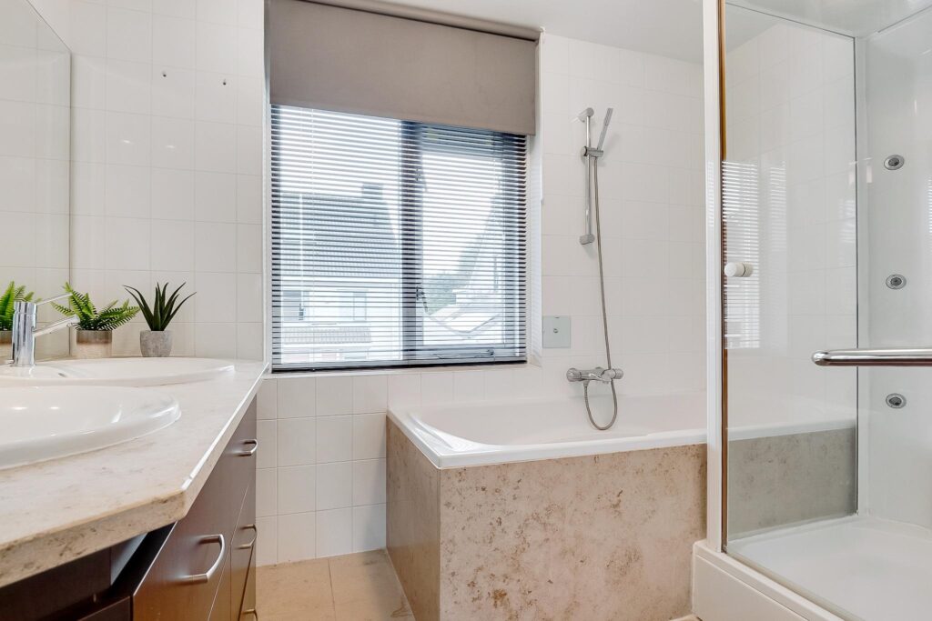 Er is een separaat toilet met een hangcloset en fontein in hetzelfde design als de badkamer en het toilet op de begane grond. De badkamer is voorzien van een wastafelmeubel met een dubbele spoelbak, ligbad en een douchecabine.