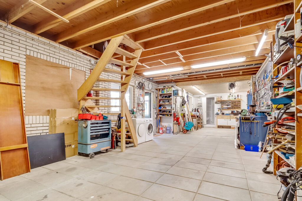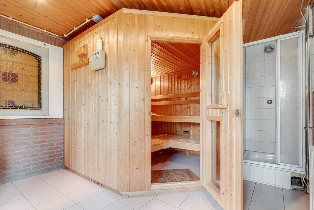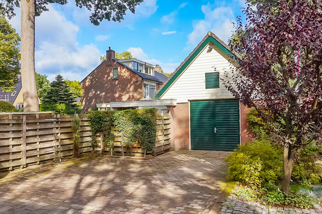 Aan de achterzijde van het perceel bevindt zich een zeer ruime garage met vliering (ca. 54 m²) met dubbele deuren, perfect voor hobby’s, opslag of meerdere auto’s. Daarnaast is er een berging en een bijgebouw met een sauna, ideaal voor ontspanning of extra opslagruimte.