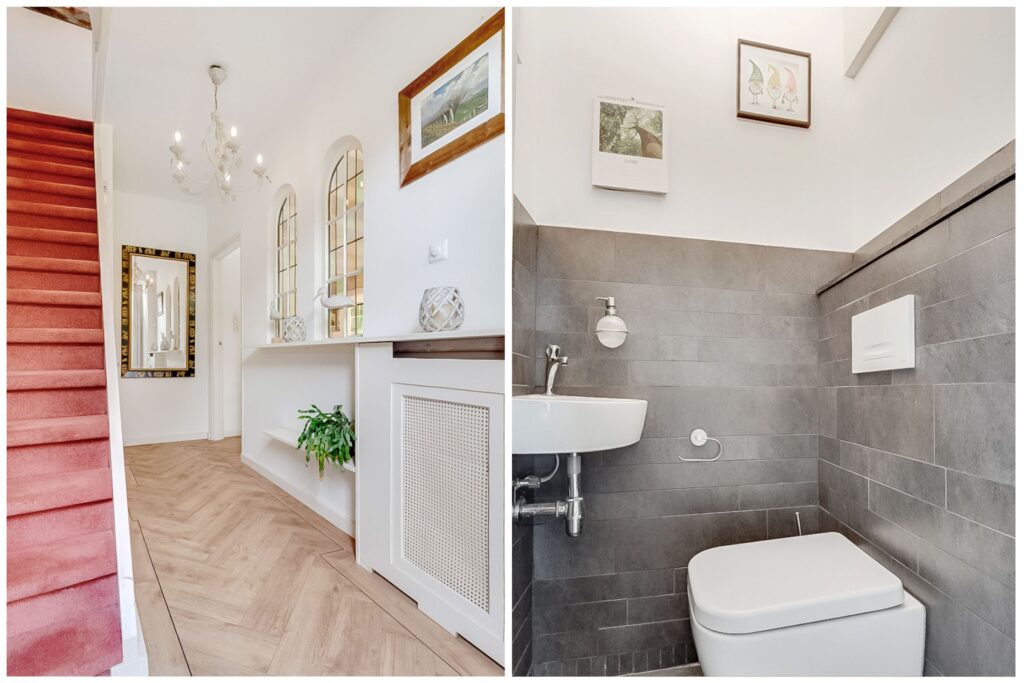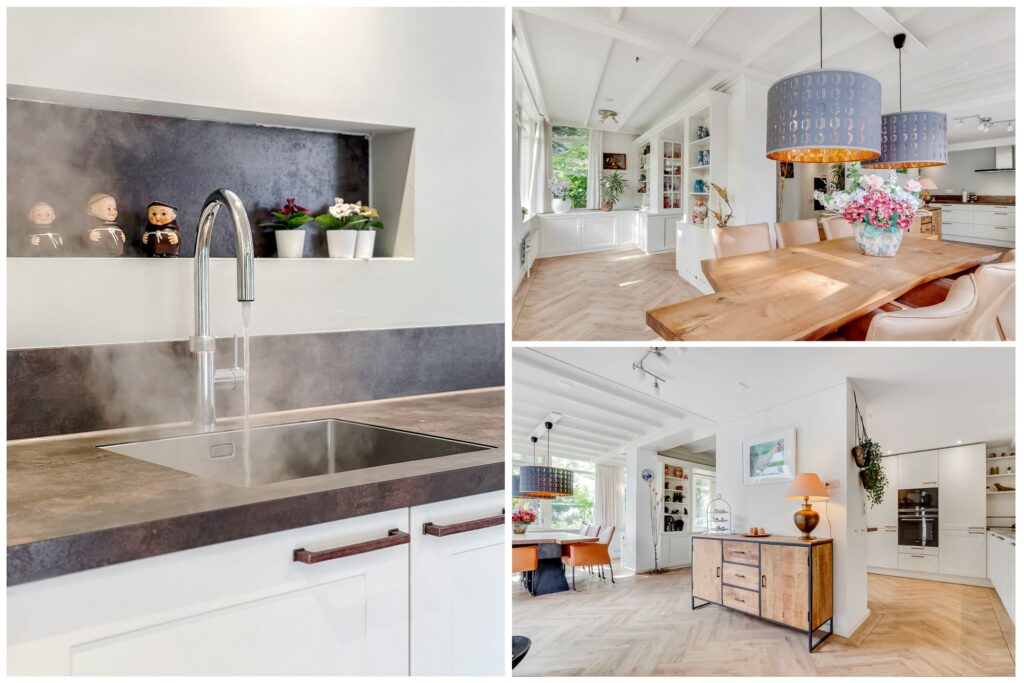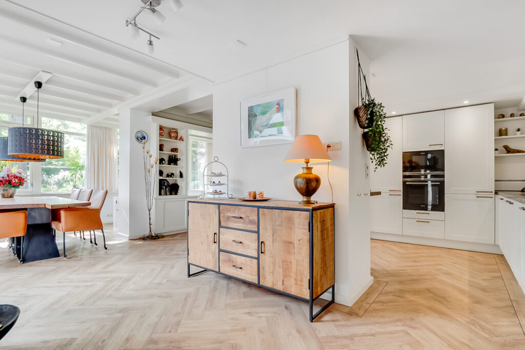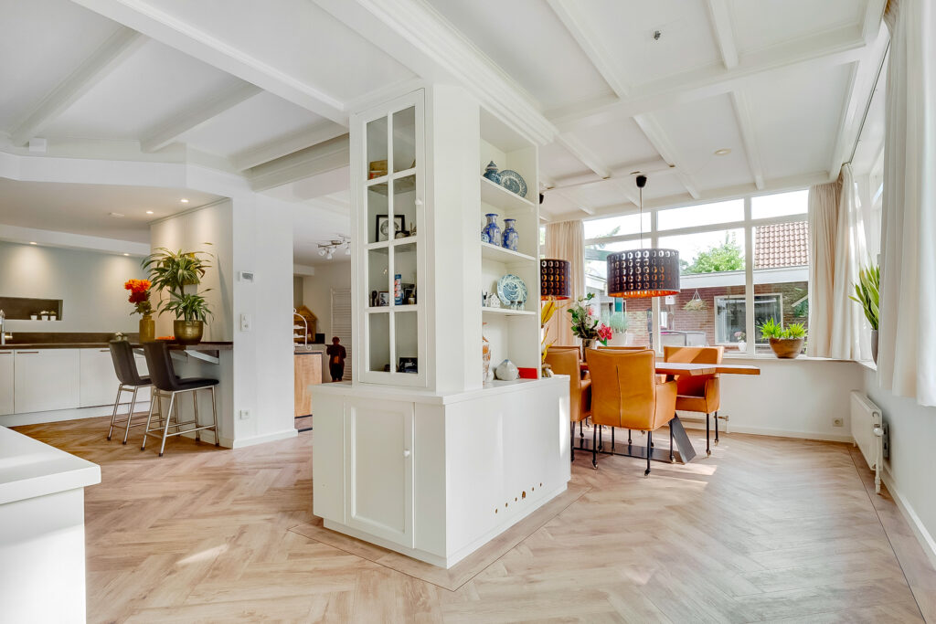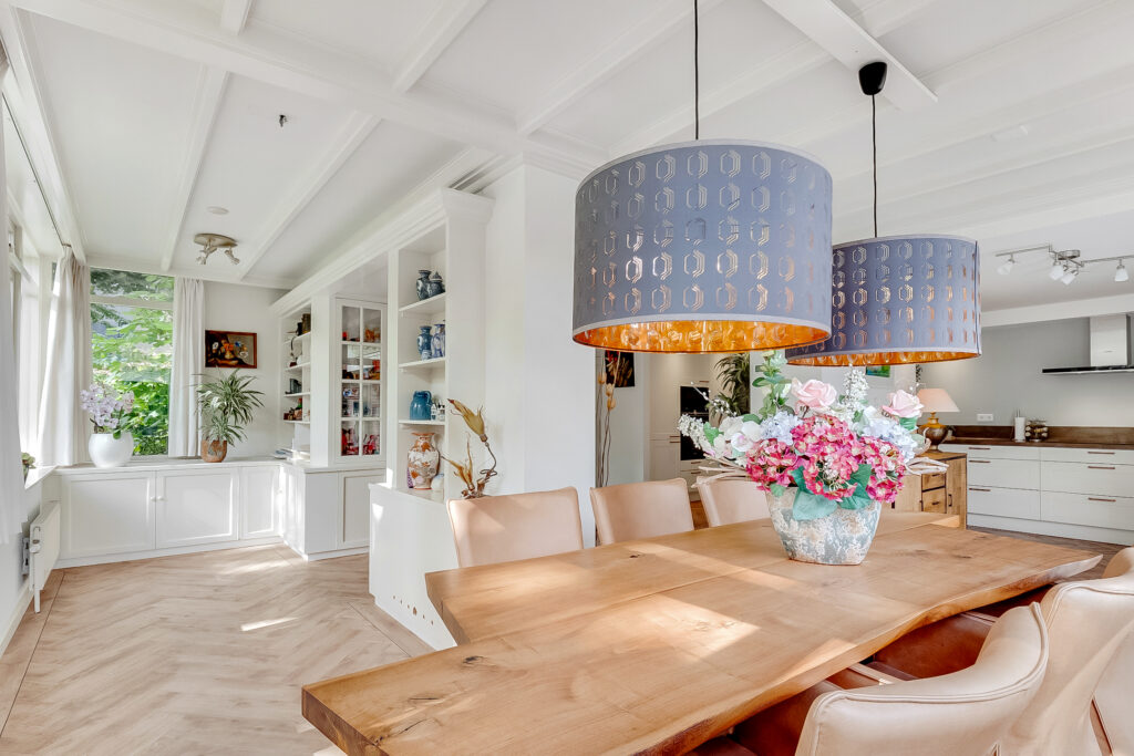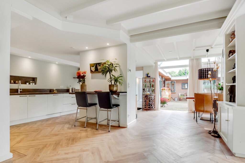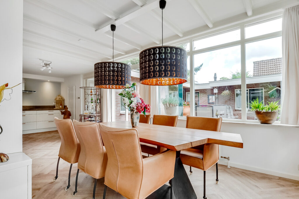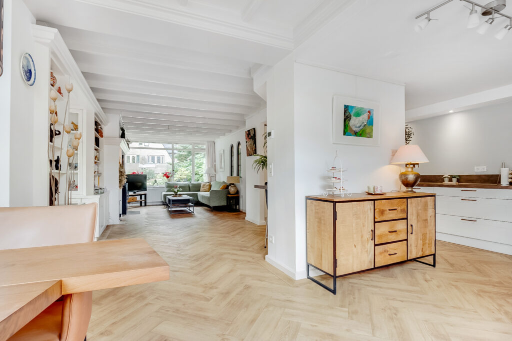 Begane grond: via de entree met trapopgang, garderobe en modern toilet betreed je de woning. Aan de voorzijde bevindt zich de sfeervolle woonkamer met grote raampartijen die zorgen voor veel lichtinval. De woonkamer staat in open verbinding met de royale eetkamer en de moderne keuken met luxe inbouwapparatuur. De begane grond is voorzien van vloerverwarming, wat extra comfort biedt.
