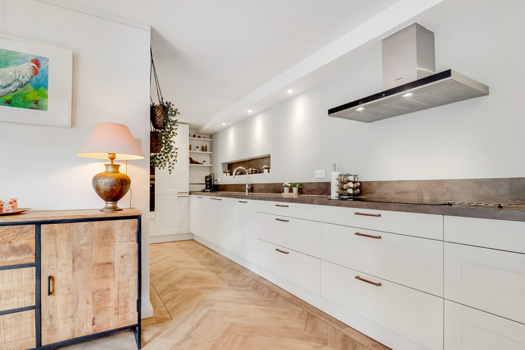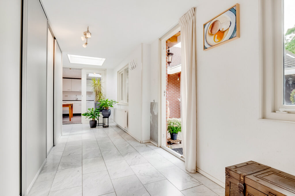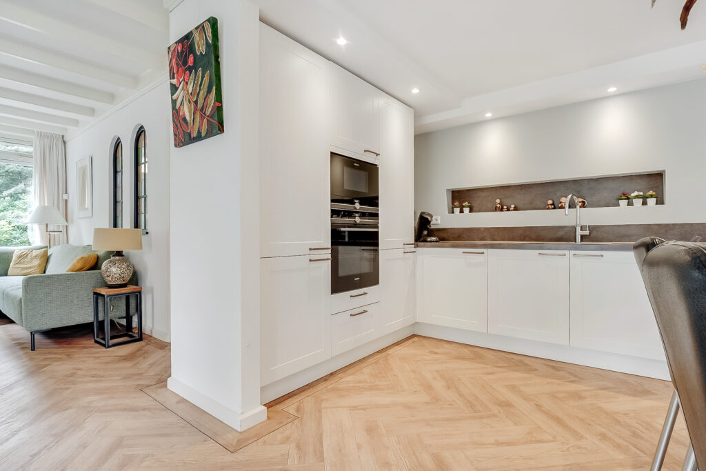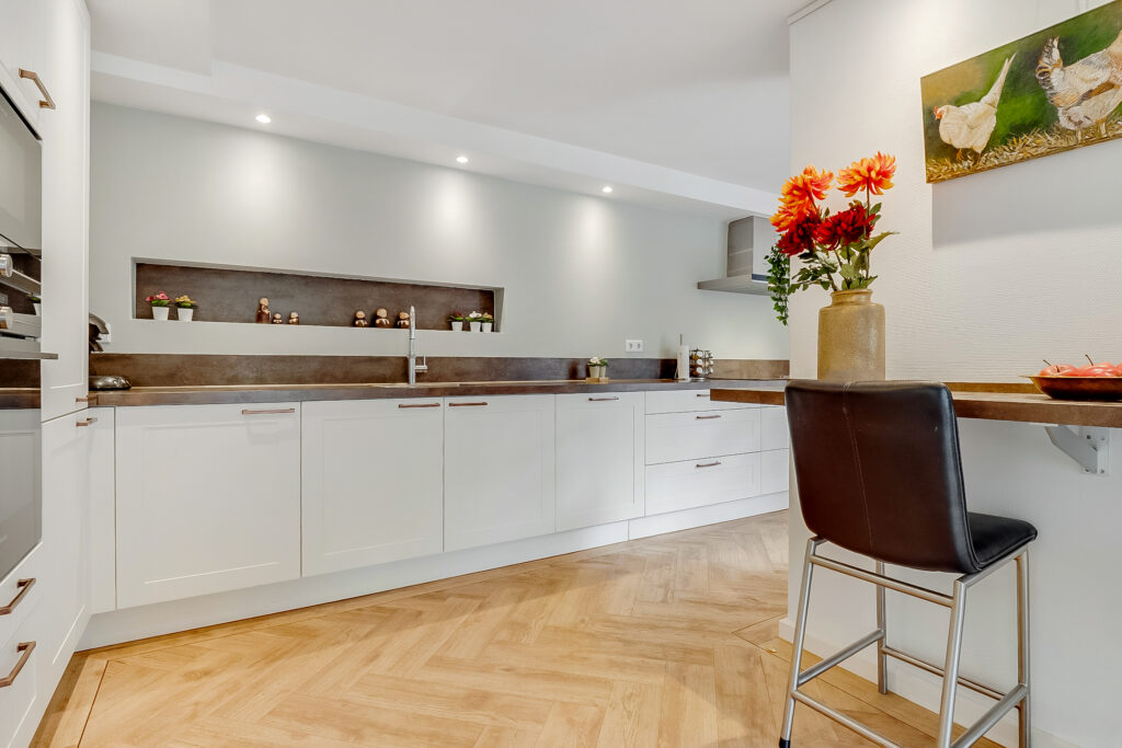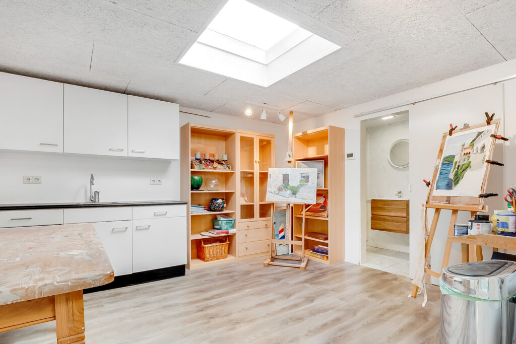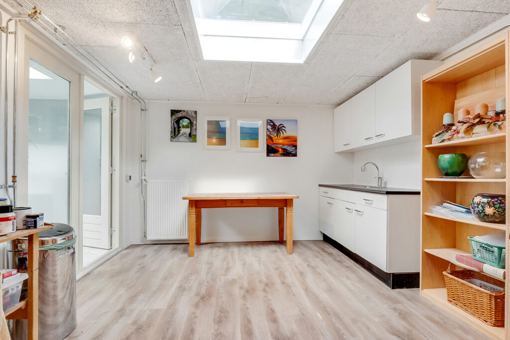 Aangrenzend vind je de praktische bijkeuken met vaste kastenwand en achterdeur naar de tuin. Vanuit hier is er toegang tot een werk-/slaapkamer en een complete badkamer op de begane grond, ideaal voor gelijkvloers wonen of als gastenverblijf.