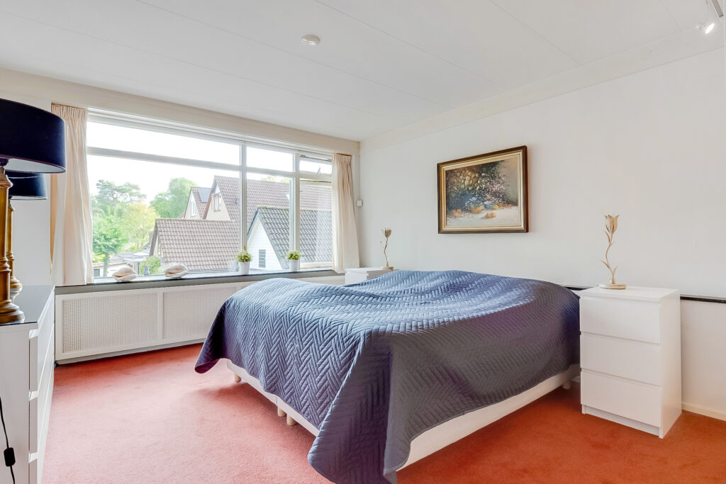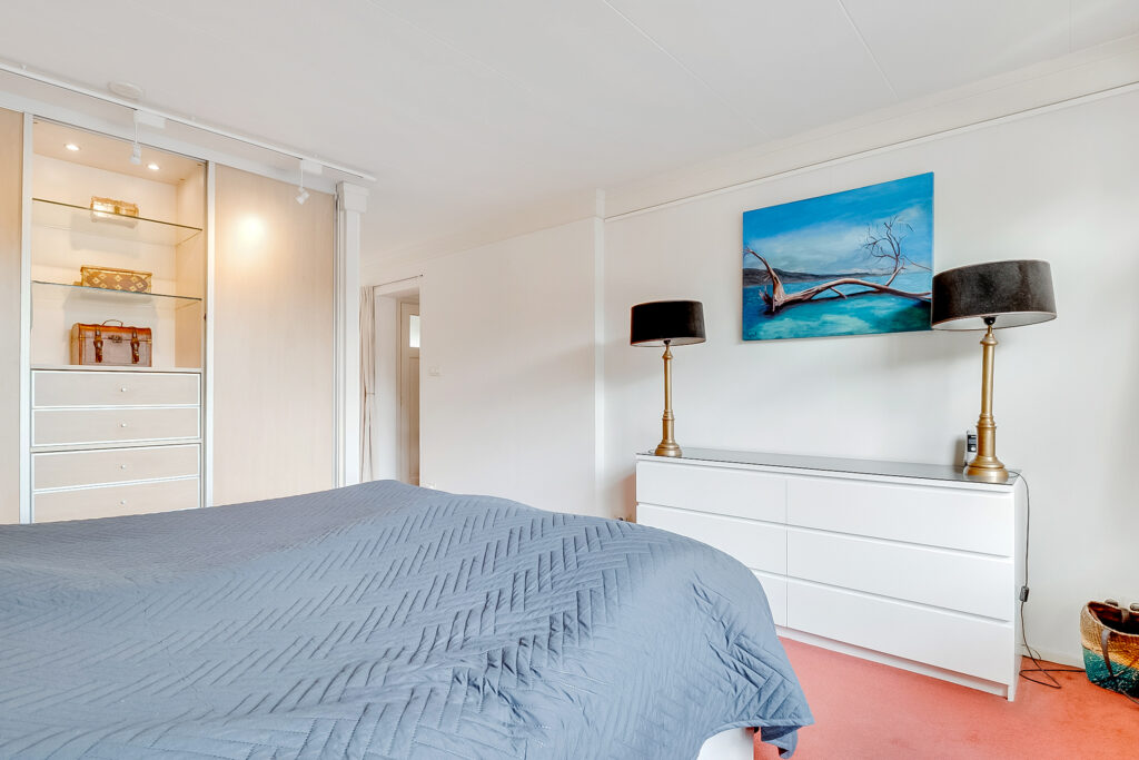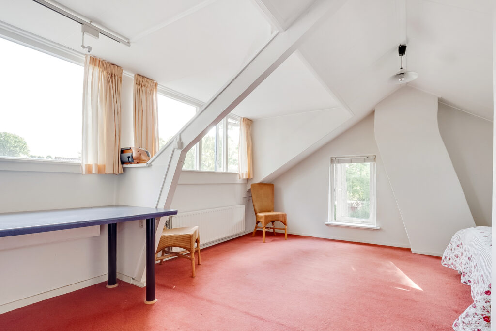 De vaste trap leidt naar de tweede verdieping waar een royale slaapkamer met dakkapel en praktische bergruimte aanwezig is. Dankzij de afmetingen is dit een volwaardige verdieping, die ook uitstekend kan dienen als logeer- of hobbykamer.