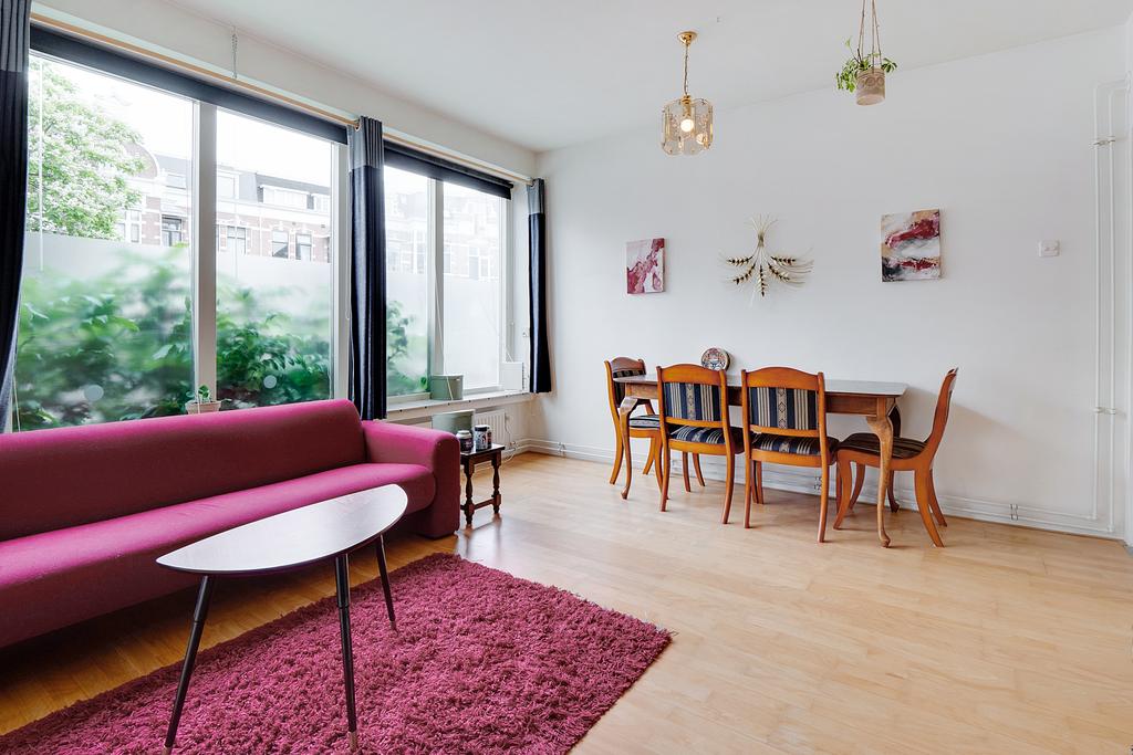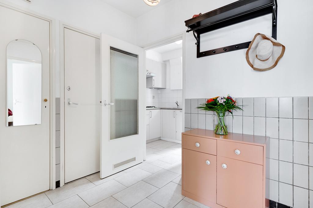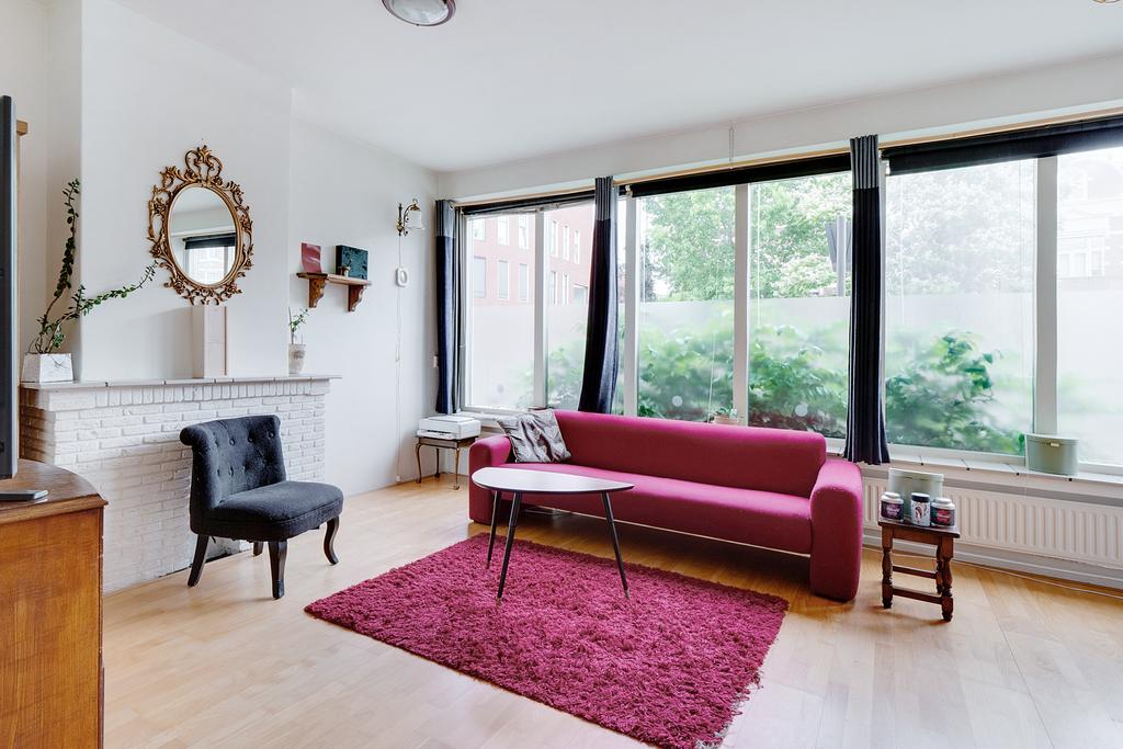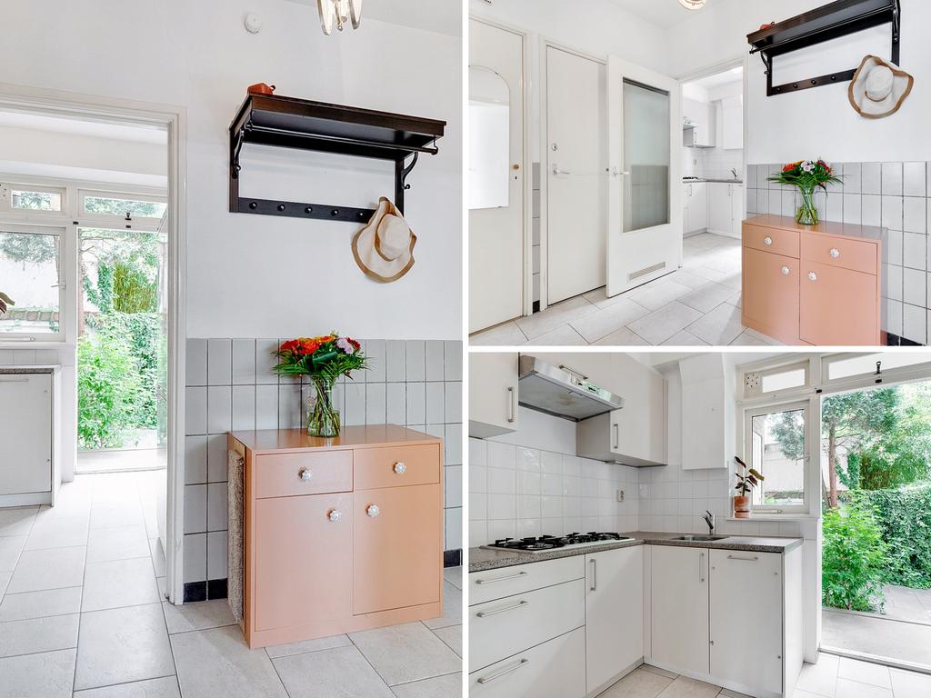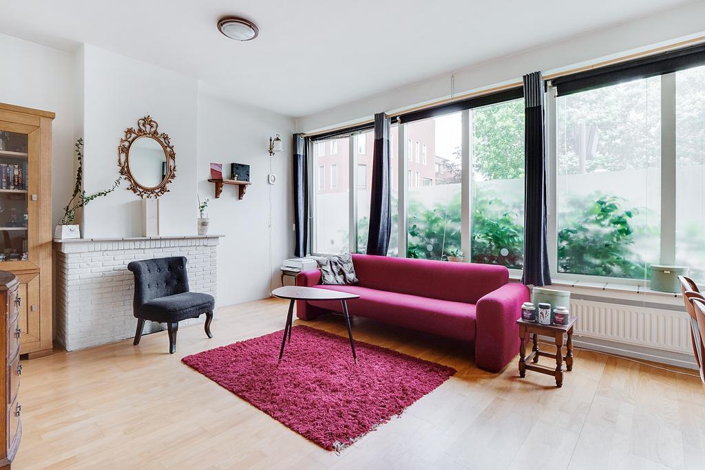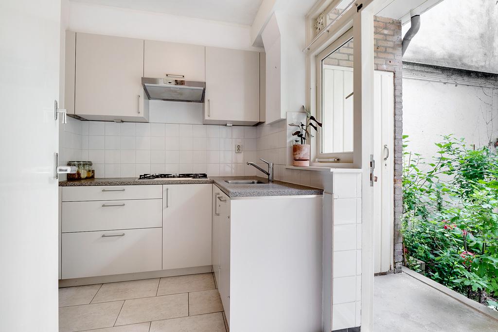 Begane grond: Entree, Ruime hal met toilet en meterkast; Nette keuken met toegang naar de ruime achtertuin met stenen aangebouwde ruimte waar de wasmachine-aansluiting en de cv opstelling in geplaatst is. Badkamer met douche en wastafel. Lichte woonkamer; Slaapkamer aan de achterzijde. De woning is geheel voorzien van dubbele beglazing. Aan de straatzijde is zeer goed isolerend extra dubbel glas aangebracht. Op de vloer in de hoofdruimte ligt beuken lamellenparket, in de keuken, hal en toilet marmoleum.