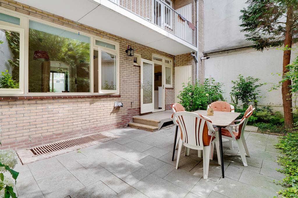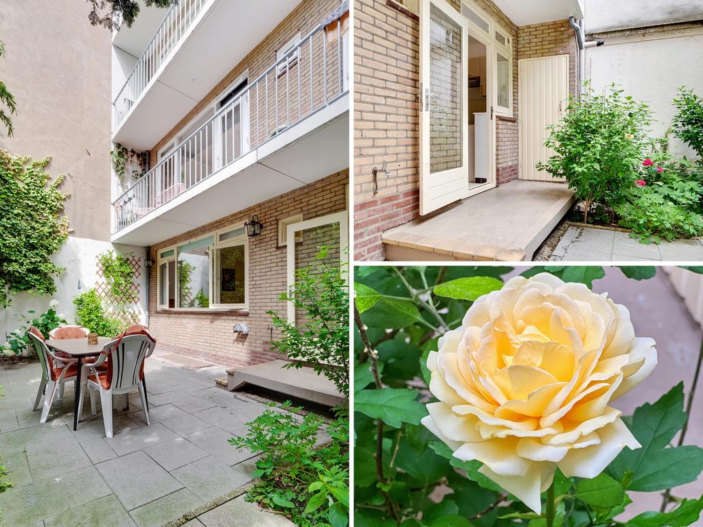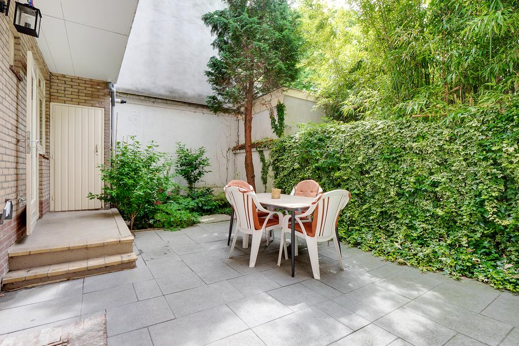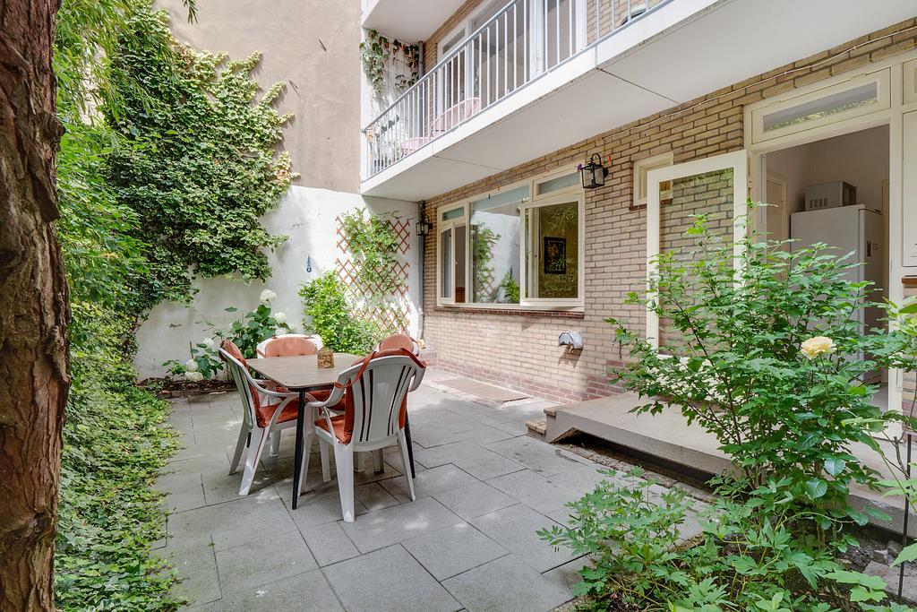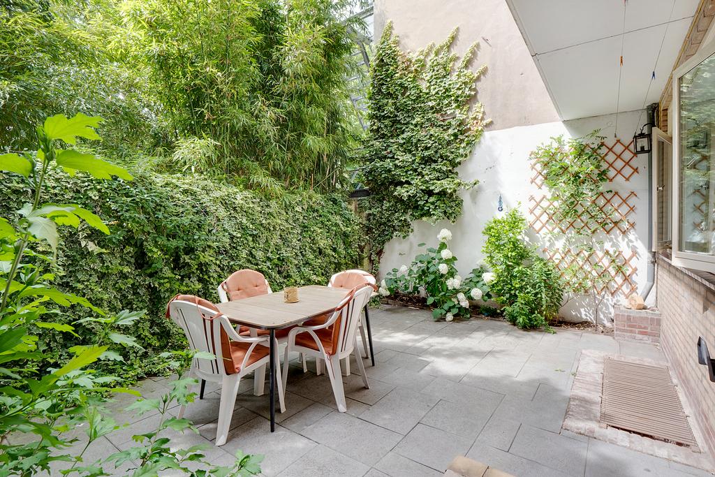 De omringende bebouwing links en rechts van het pand vormt een wal voor het straatgeluid waardoor de tuin heerlijk rustig is, met veel vogels en met zicht op de grote bomen van een binnentuin. De tuin biedt ook veel zon en privacy; een onverwachte oase van rust.