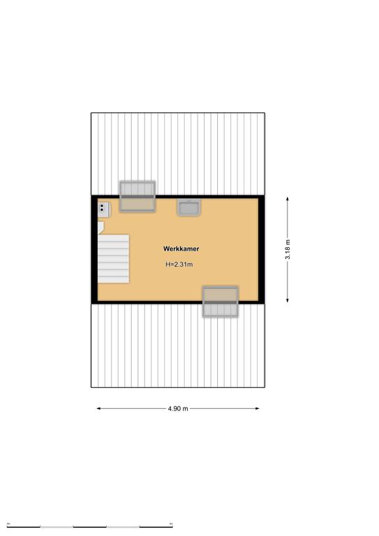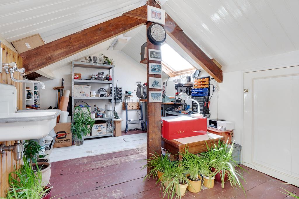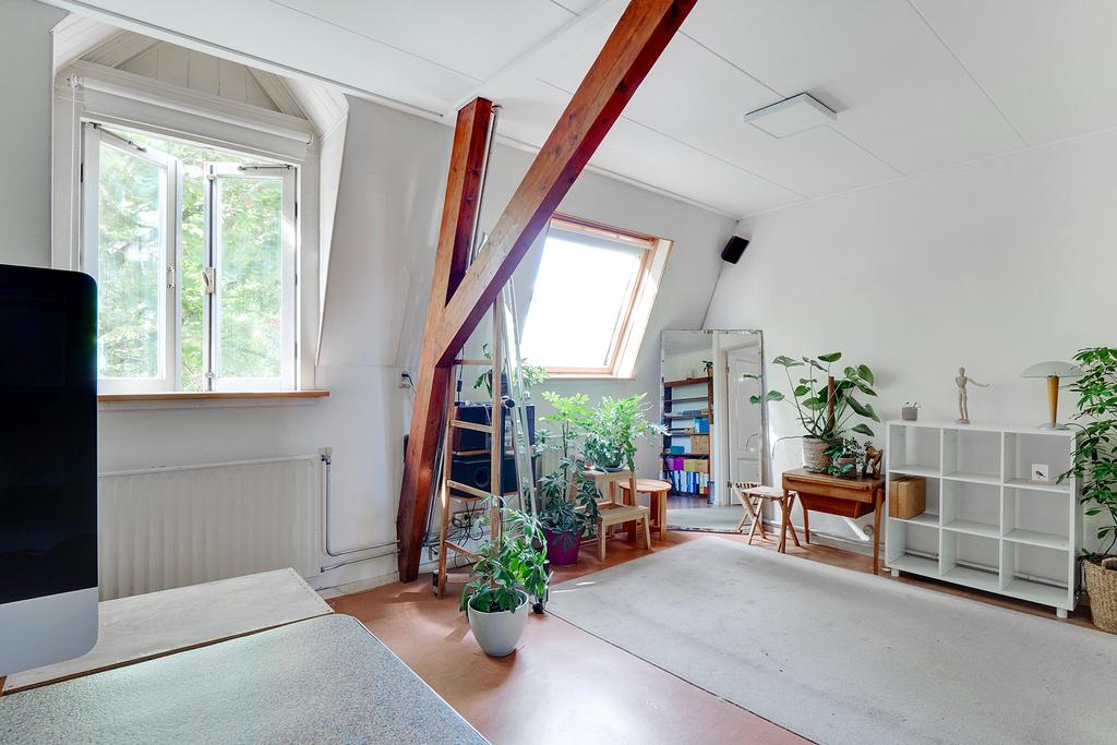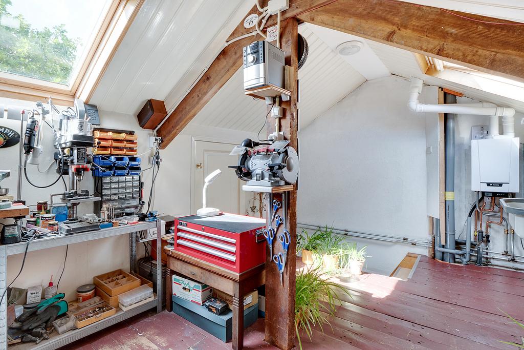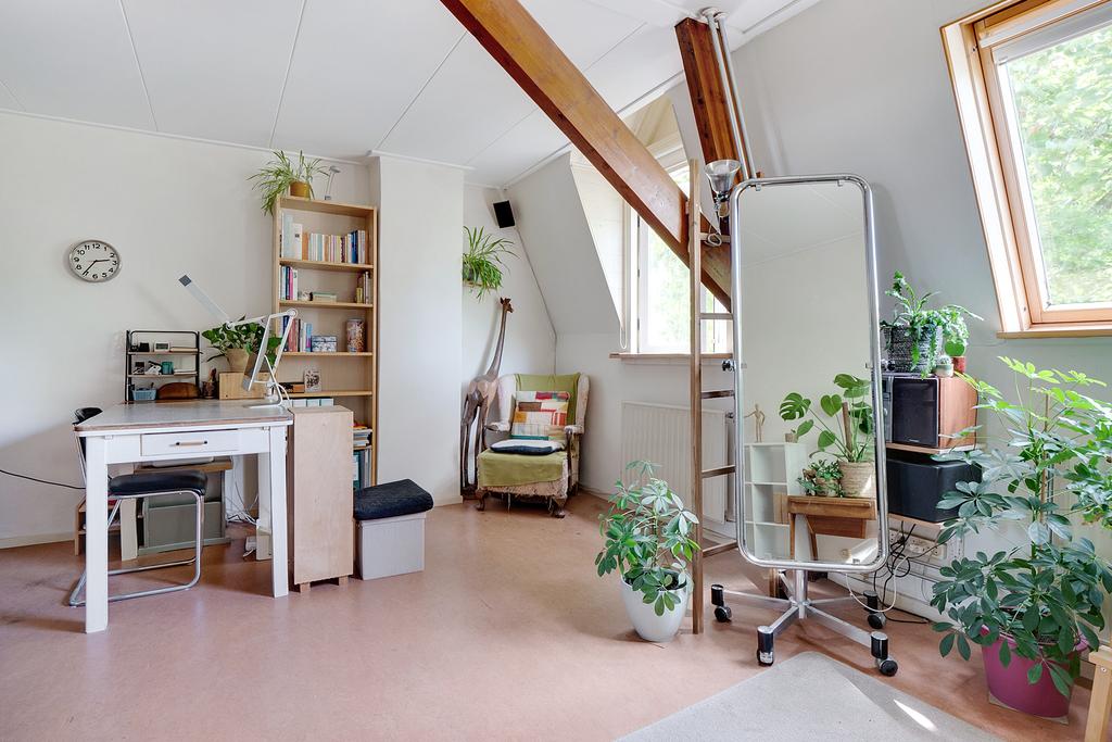Zolderverdieping: slaap/werkruime met wastafel voorzien van Velux dakramen en cv opstelling.