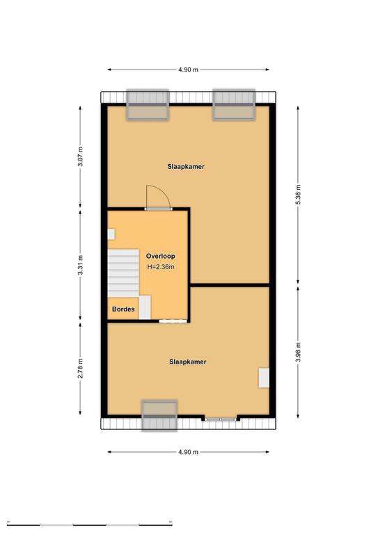 Tweede verdieping: via een vaste trap bereik je de ruime overloop met toegang naar een slaapkamer aan de voorzijde en een slaapkamer aan de achterzijde.