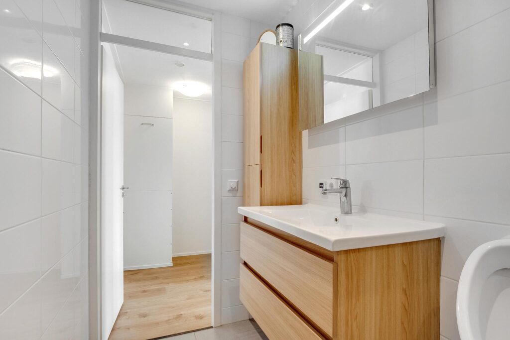 Eerste verdieping: overloop met badkamer, uitgerust met douche, urinoir en wastafel. Aan de voorzijde een ruime slaapkamer met veel lichtinval.