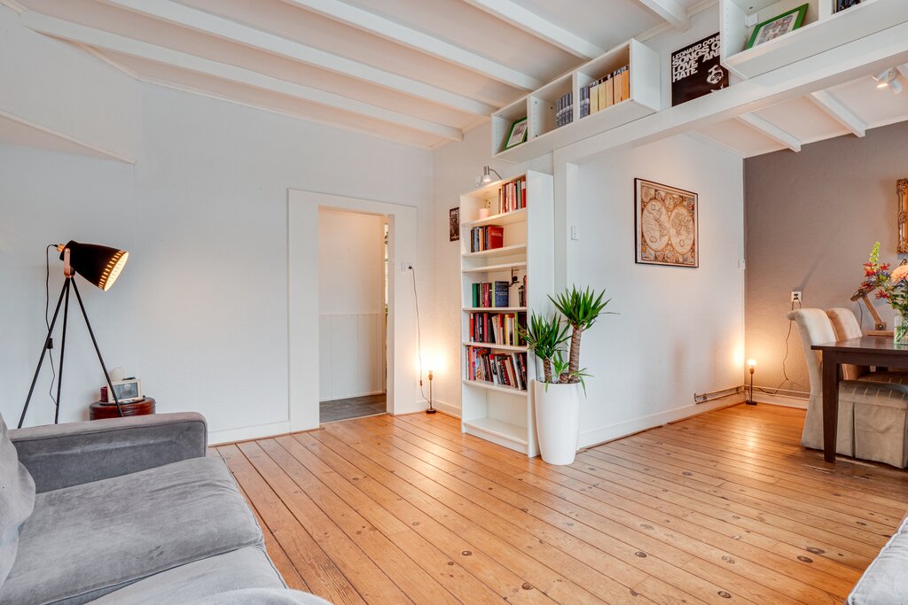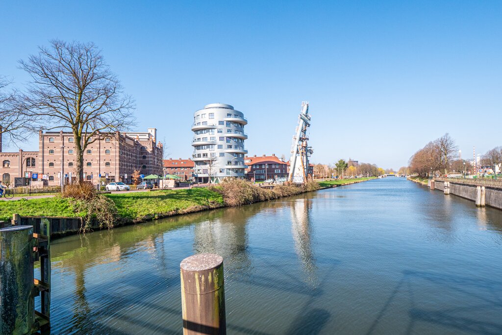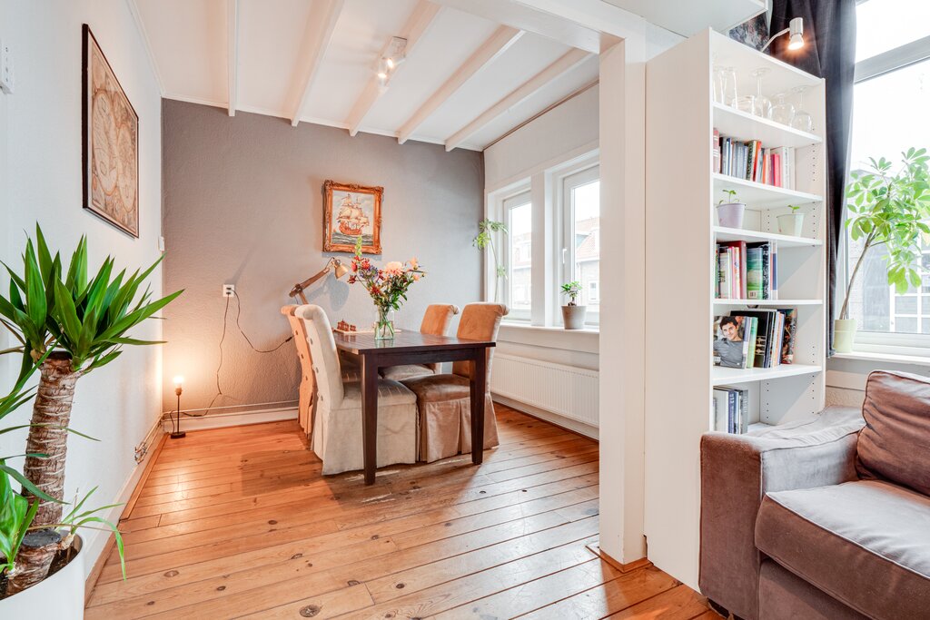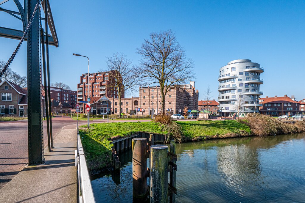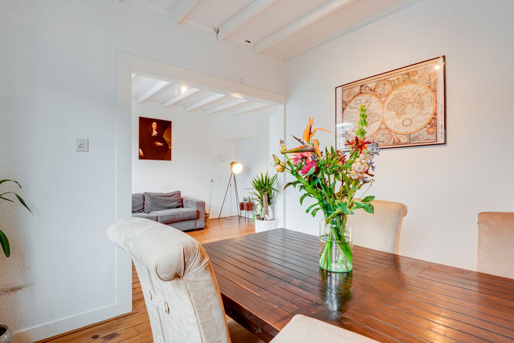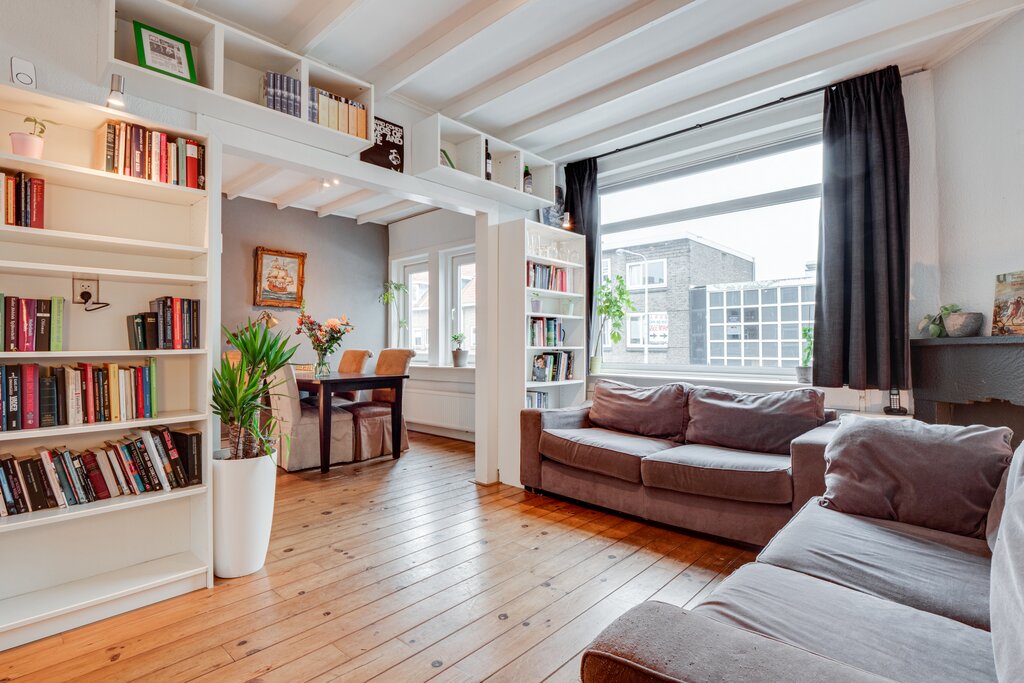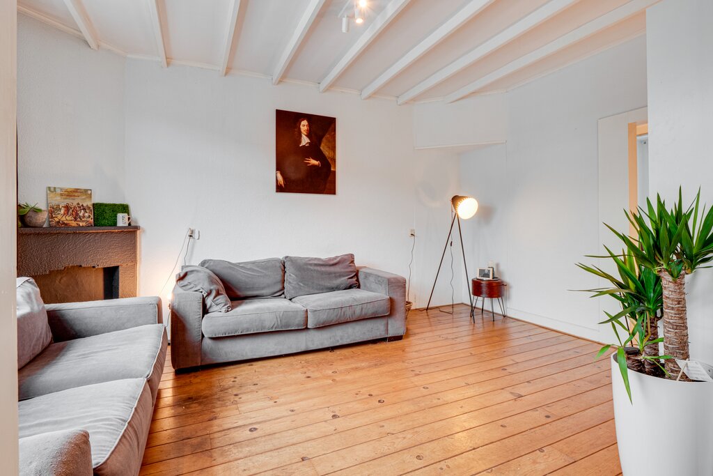 1e verdieping: entree/gang, berging en toilet; ruime lichte L-vormige woonkamer (bestaande uit woon- en eetkamer) met karakteristiek balkenplafond. Dichte keuken met inbouwapparatuur. Via de keuken is er toegang naar de badkamer met douche, wastafel en aansluiting voor de wasmachine en droger. Tevens is het ruime balkon met mooi en vrij uitzicht vanuit de keuken toegankelijk. De slaapkamer is gelegen aan de achterzijde.