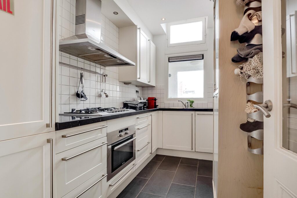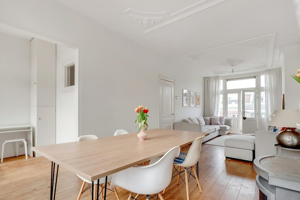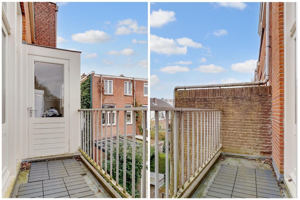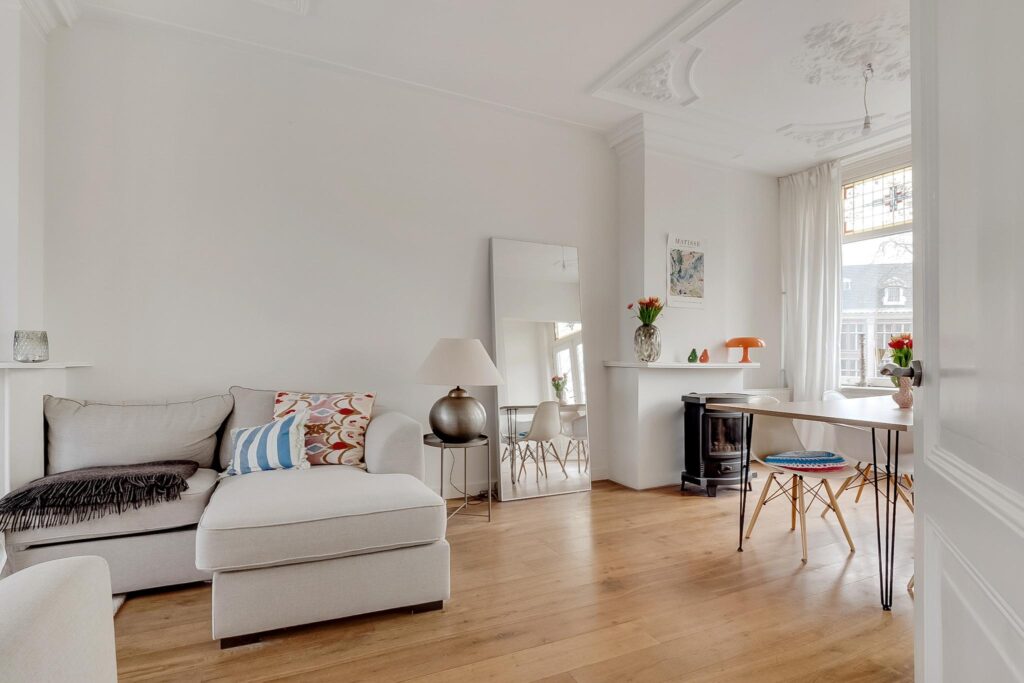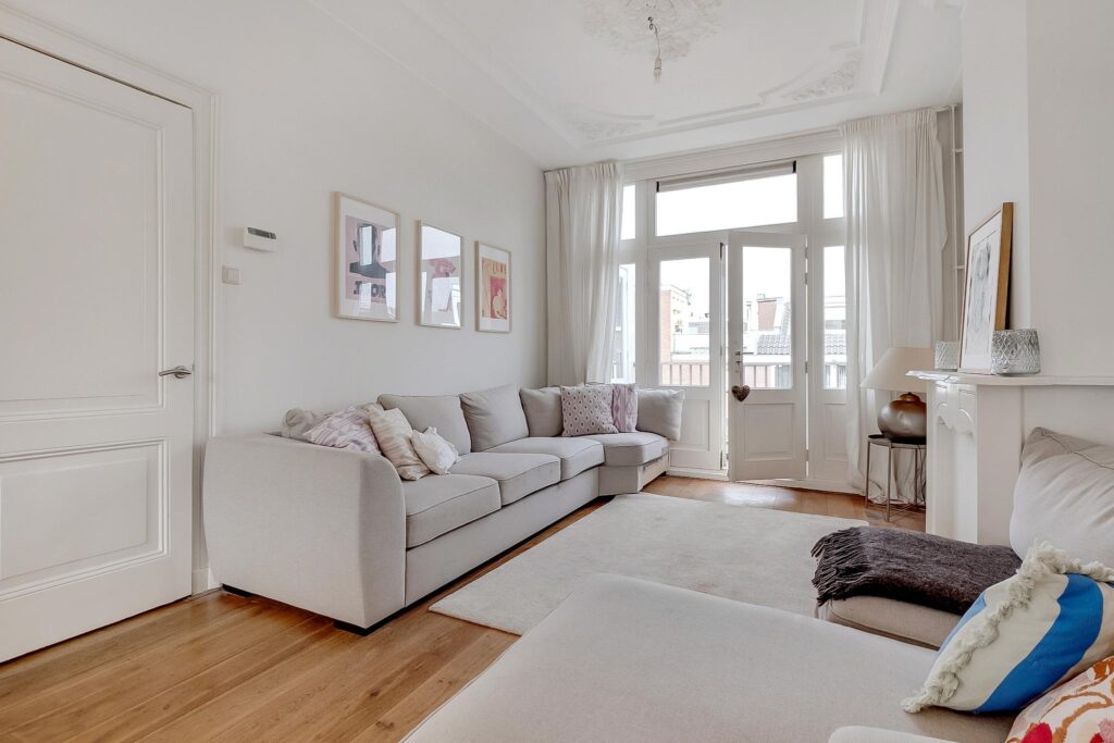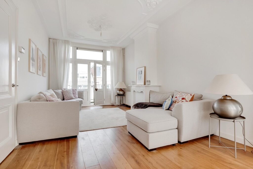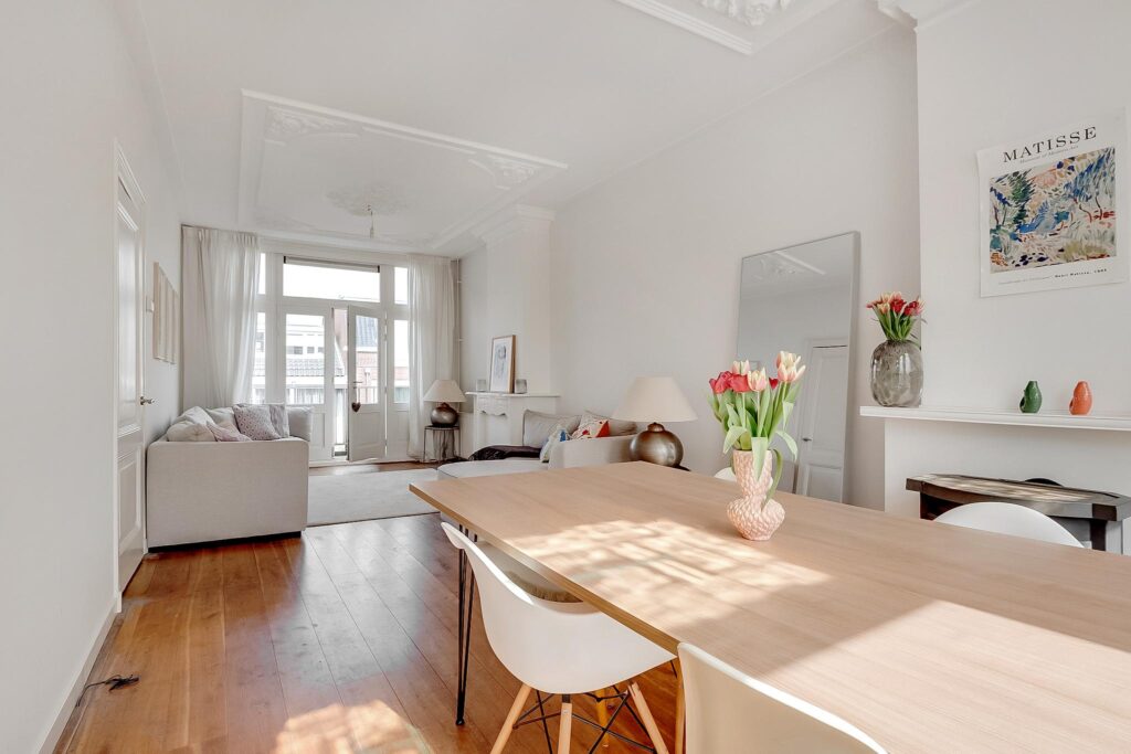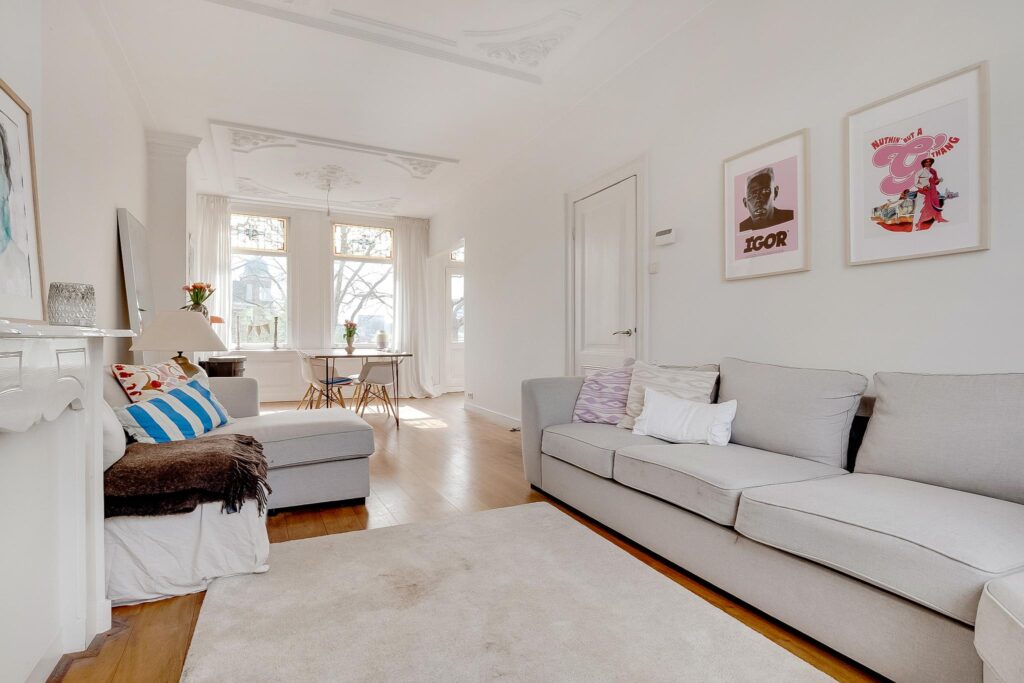 Overloop, vrij hangend toilet. De royale L-vormige woonkamer is bijzonder licht en hoog, en voorzien van een massief houten vloer, glas-in-loodramen, een prachtig gerestaureerd ornamentenplafond en twee originele schouwen. Via openslaande deuren aan de achterzijde bereik je het balkon.