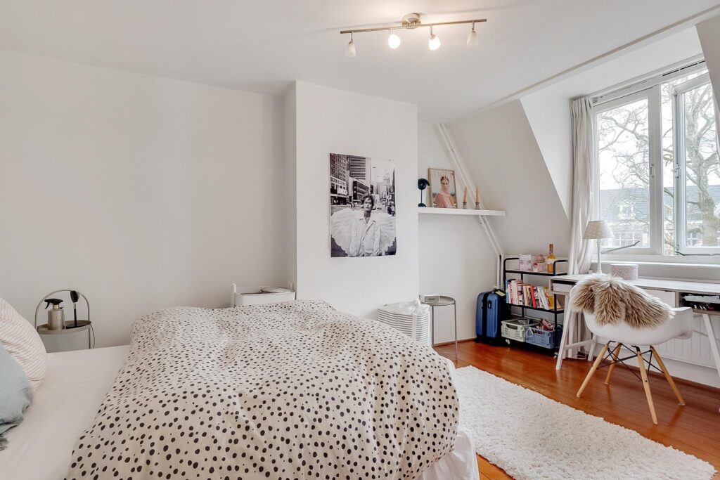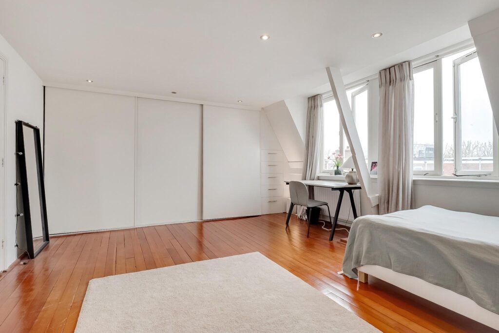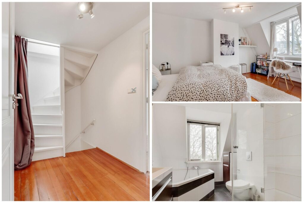 Overloop, badkamer met inloopdouche, ligbad, wastafel en tweede toilet. De ruime master bedroom beschikt over een vaste schuifkastenwand en inbouwspots. De tweede slaapkamer is voorzien van een kastenwand en een dakkapel. De gehele verdieping is afgewerkt met een houten vloer en glad gestucte wanden en plafonds.