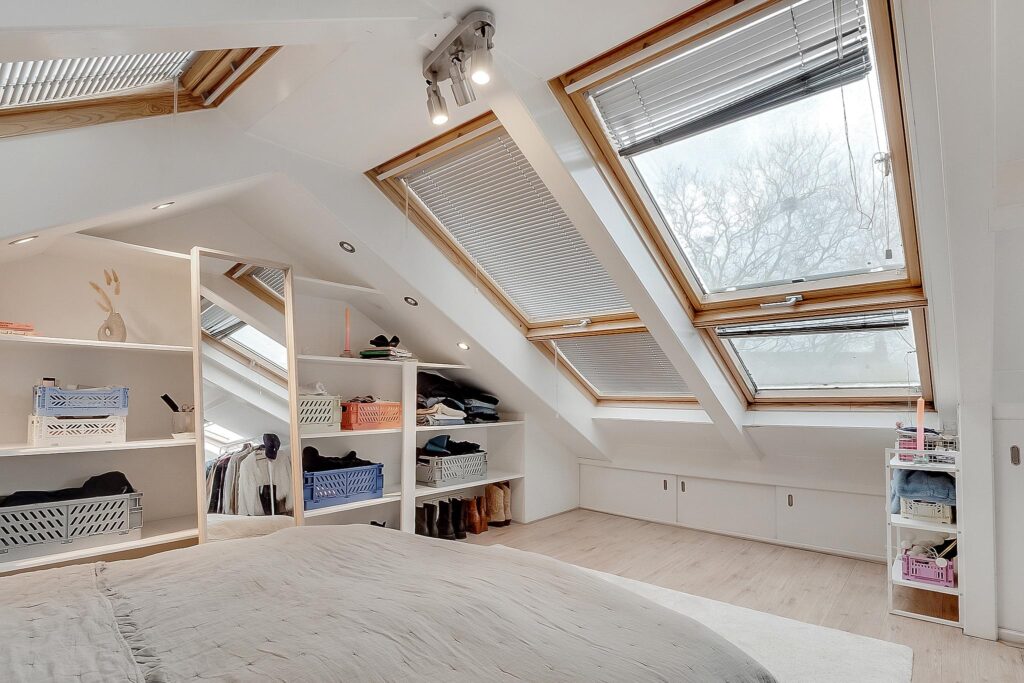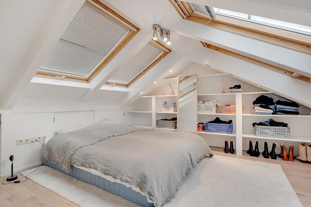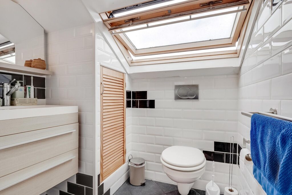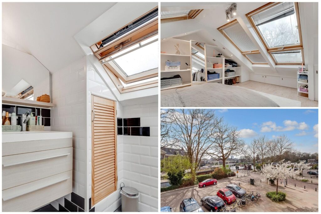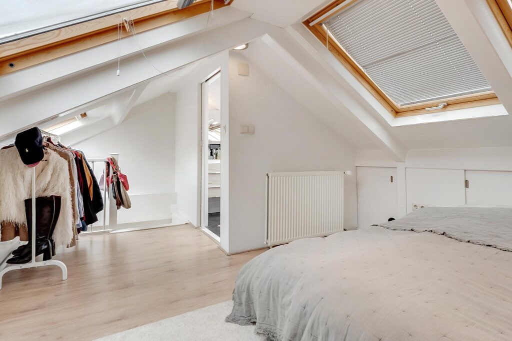 Ruime slaap-/hobbykamer met een eigen toilet en wastafel. De hoogte bedraagt circa 1,80 meter, maar dankzij de maar liefst acht Velux dakramen is de lichtinval hier fantastisch.