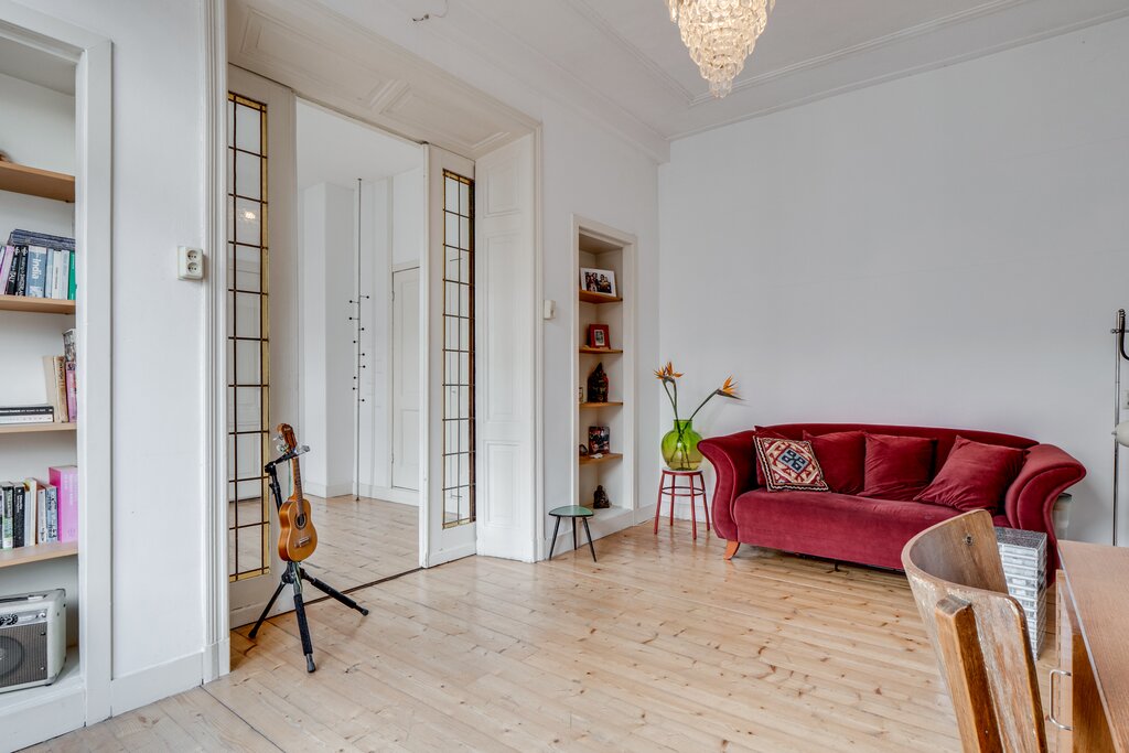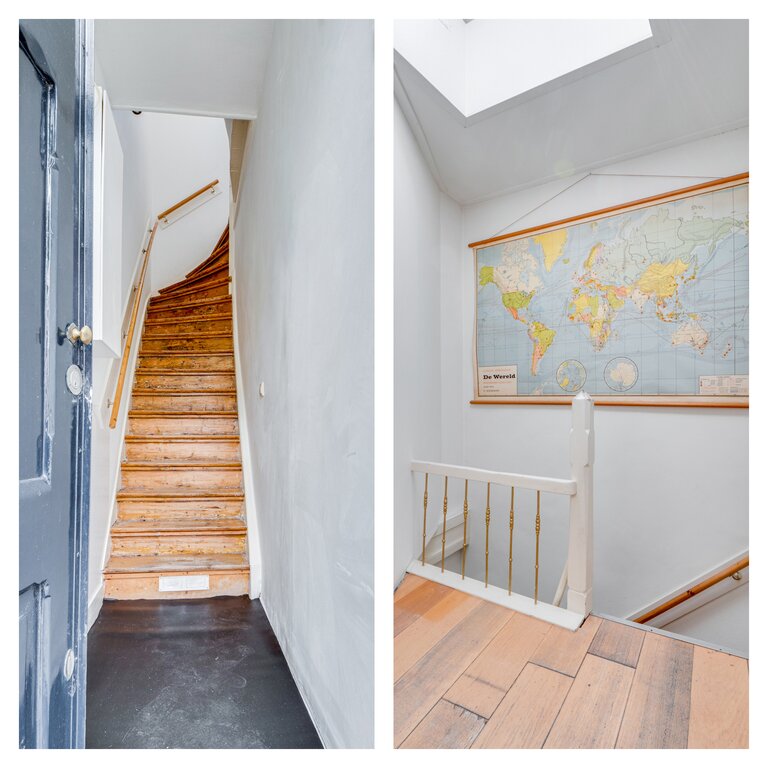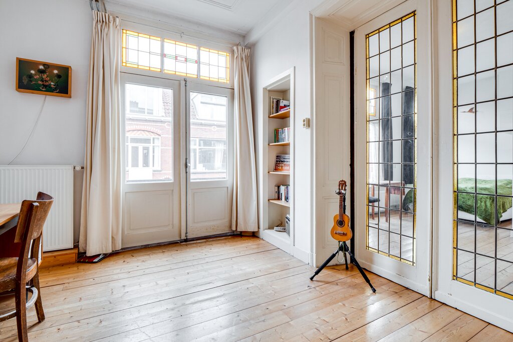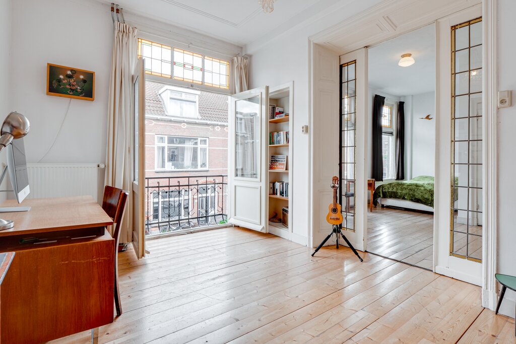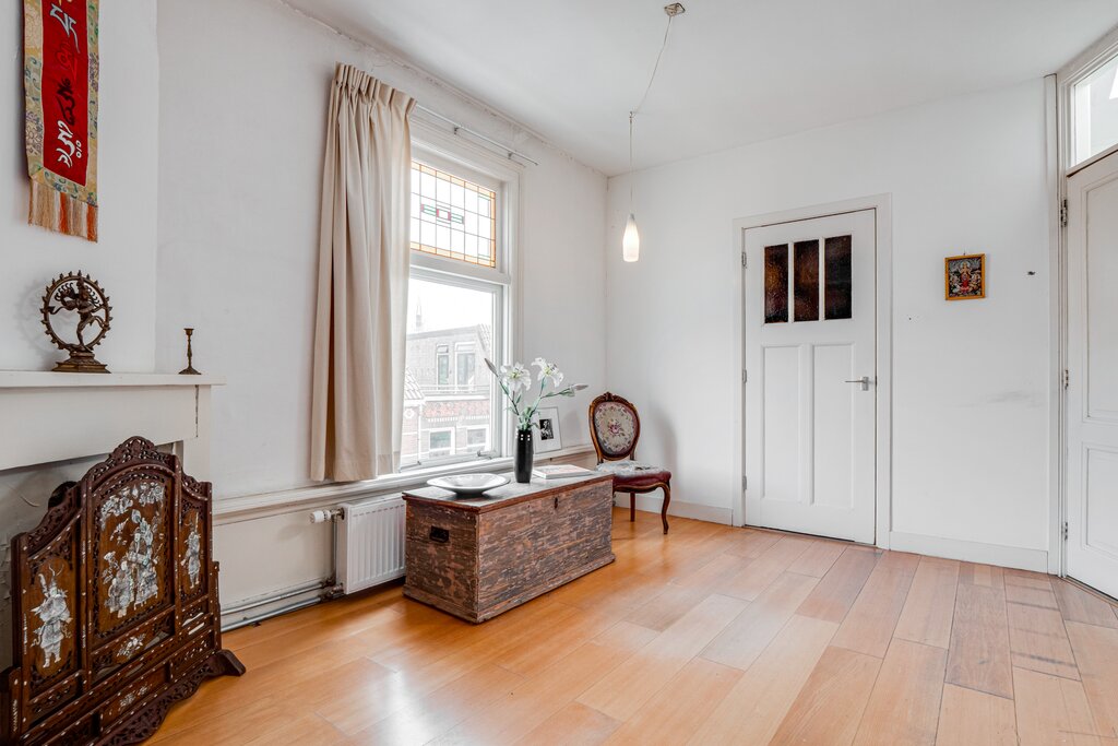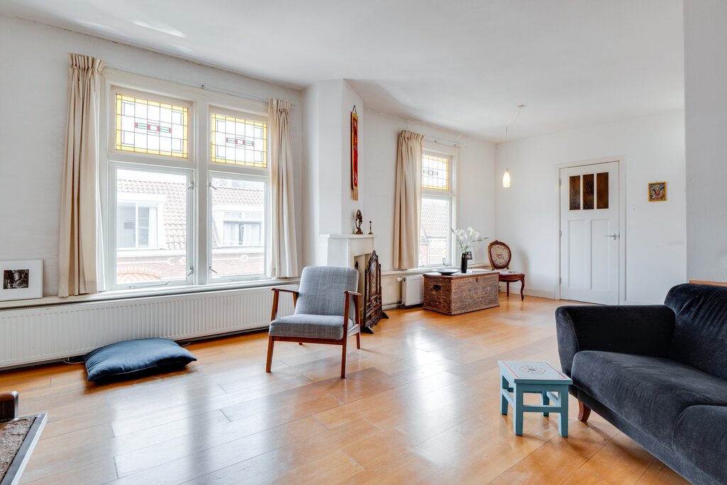 Sfeervolle en ruime bovenwoning met mooie hoge raampartijen en veel lichtinval. De combinatie van de ruime vertrekken en de speelse indeling maken deze woning extra aantrekkelijk. De mooie stijlkenmerken uit de bouwperiode zijn nog aanwezig zoals de kamer en suite , glas-in-lood ramen en de paneeldeuren.
