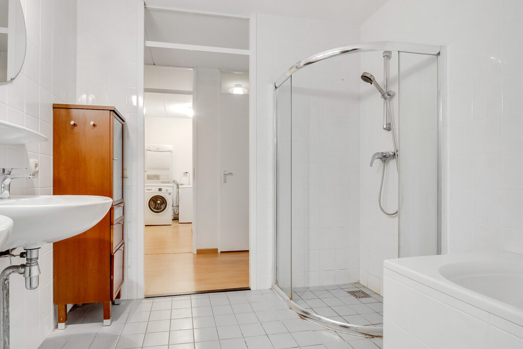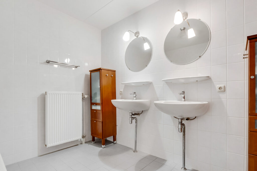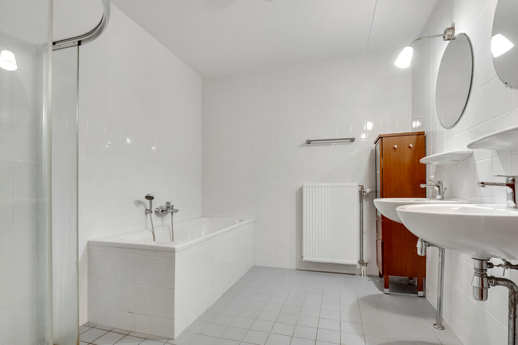 De badkamer is verzorgd afgewerkt en voorzien van een ligbad, douche en dubbele wastafel. Daarnaast is er een separaat toilet met fonteintje en een handige bergruimte die uitstekend dienst doet als wasruimte en bijkeuken.