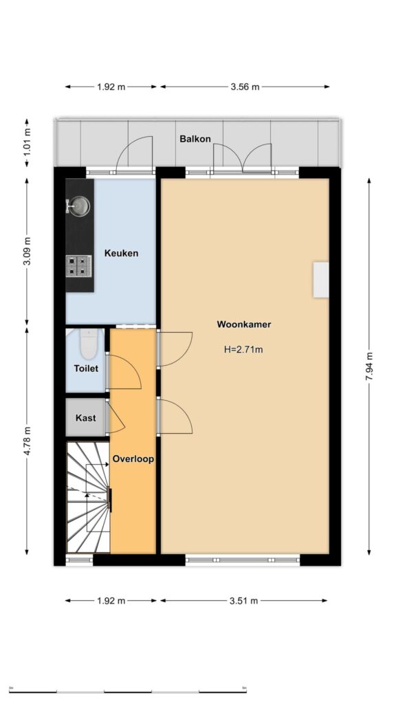 1e Verdieping: overloop met vaste kast, toilet; ruime woonkamer (eventueel op te splitsen in twee kamers) met openslaande deuren en toegang naar het balkon. De keuken is eenvoudig en vanuit de keuken is er ook toegang naar het balkon.