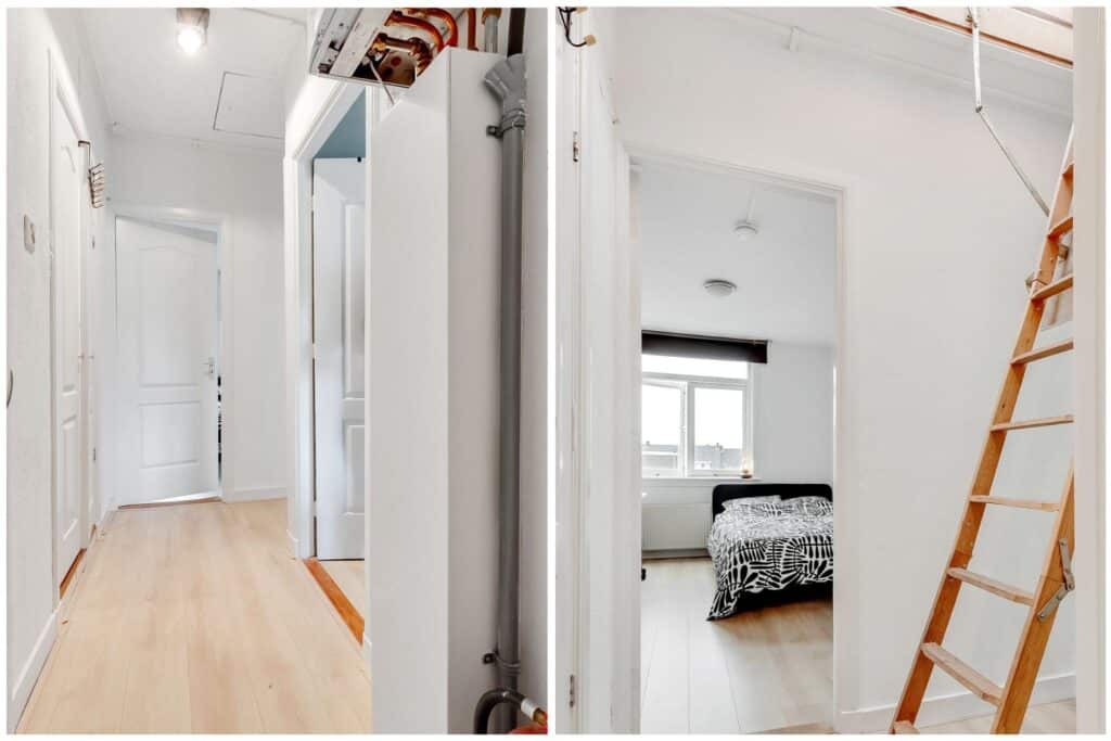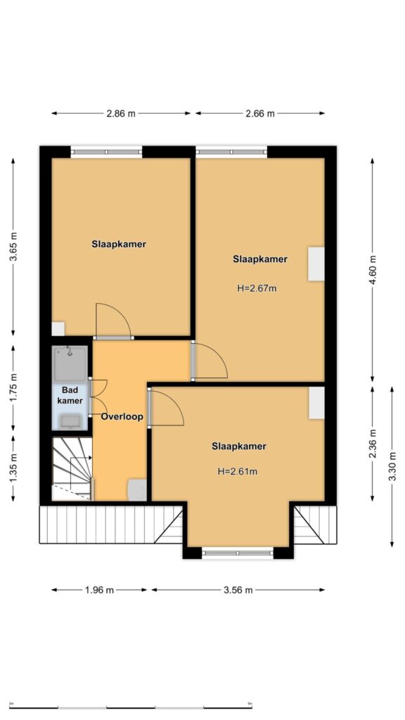 2e Verdieping: overloop (met een vlizotrap naar het dak), badkamer met douche en wastafel(meubel). Slaapkamer aan de voorzijde met dakkapel en twee ruime slaapkamers aan de achterzijde.