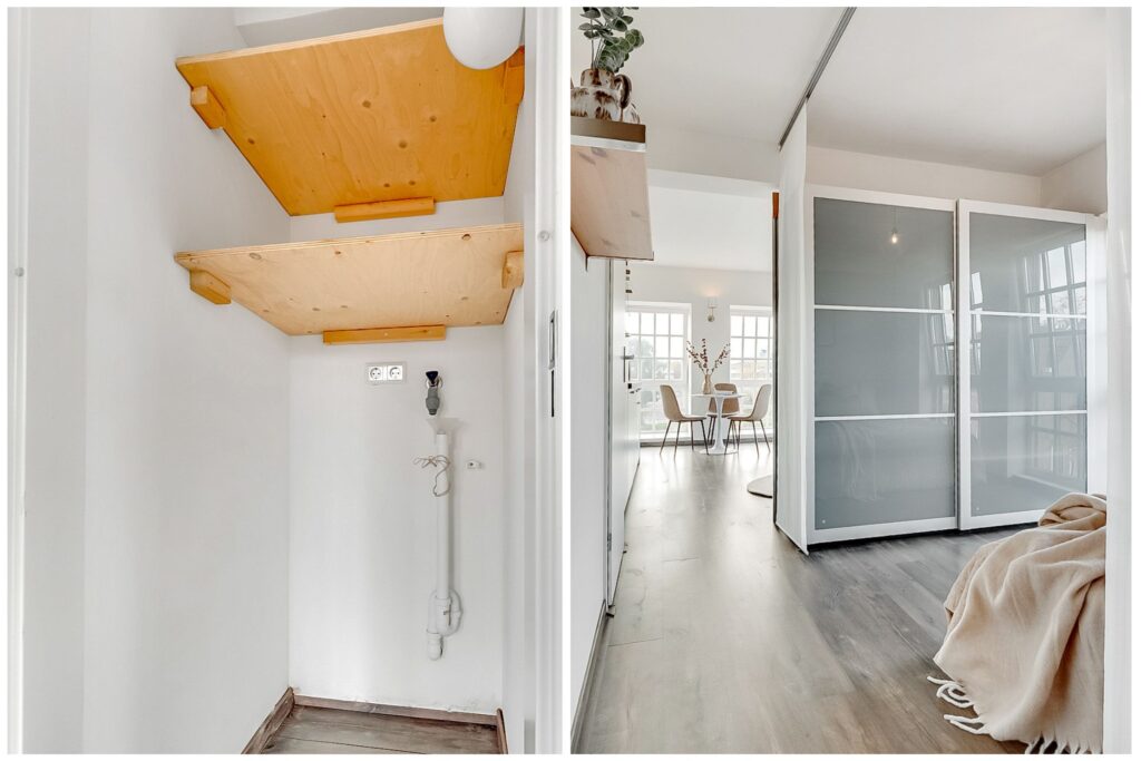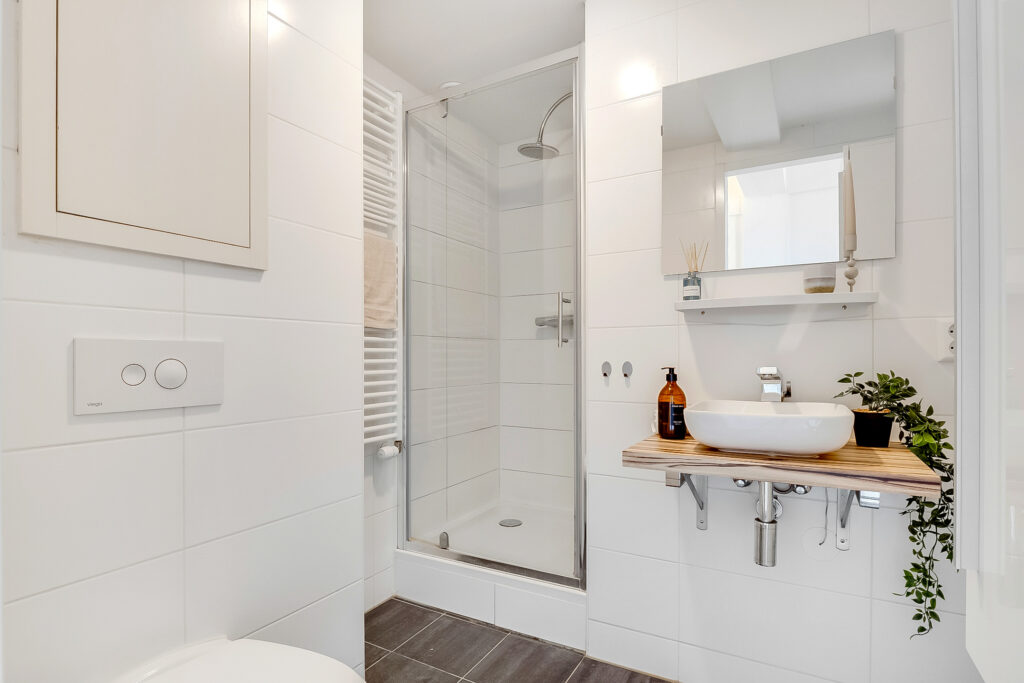2e Verdieping; entree, gang; badkamer met douche, toilet en wastafel; vaste kast met aansluiting voor een wasmachine; slaapgedeelte en woonkamer met open keuken voorzien van inbouwapparatuur. Vanuit zowel het woongedeelte als het slaapgedeelte is er vrij uitzicht over het Merwedekanaal.