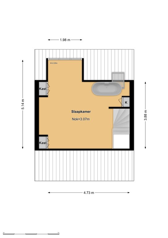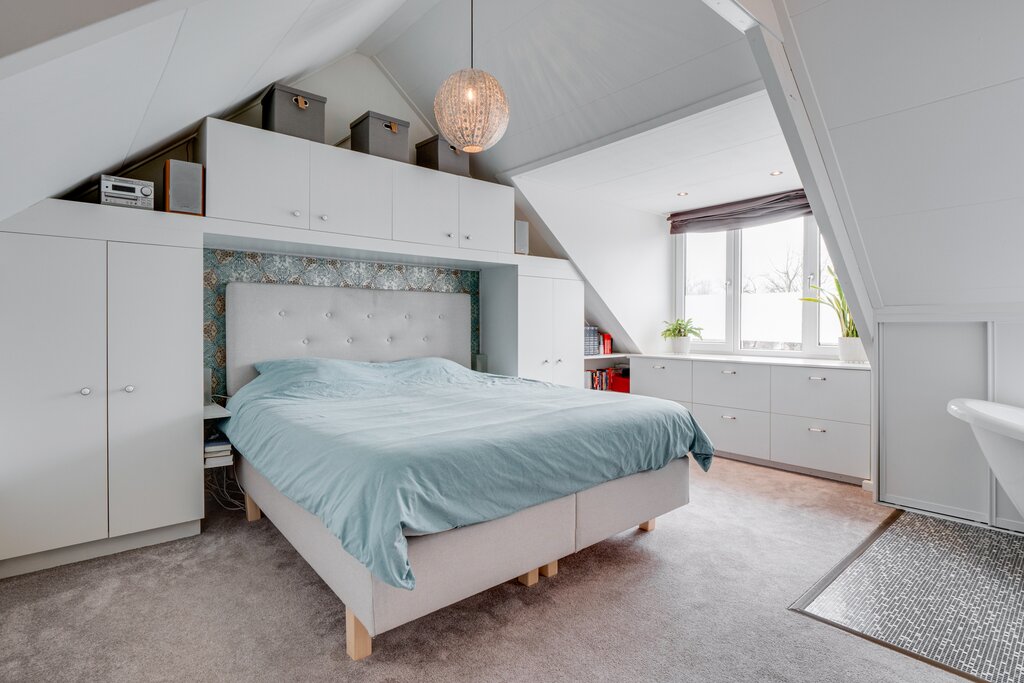2e Verdieping: ruime slaapkamer met dakkapel en dakraam. In de mooie open ruimte is er aan de achterzijde een vrijstaand ligbad geplaatst en zijn er vaste kasten voor het opbergen van spullen.
