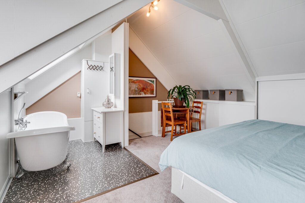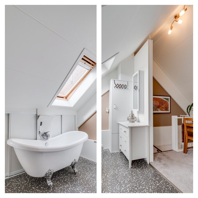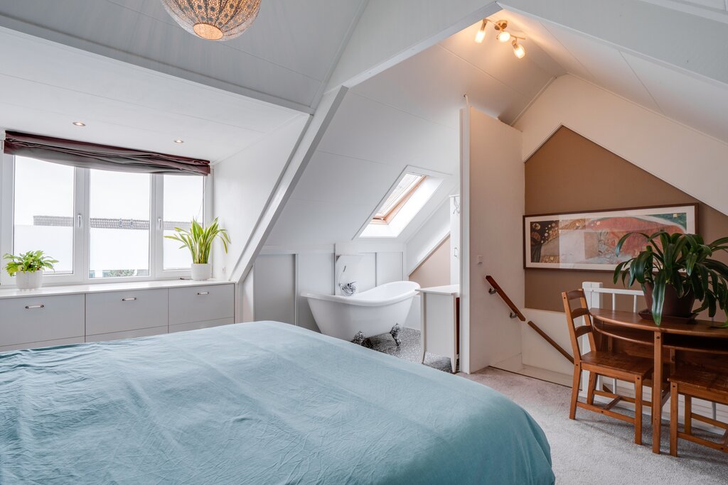 De mooie ruime en comfortabele zolderkamer met een vrijstaand ligbad en een dakkapel aan de achterzijde is in 2017 gerealiseerd.
