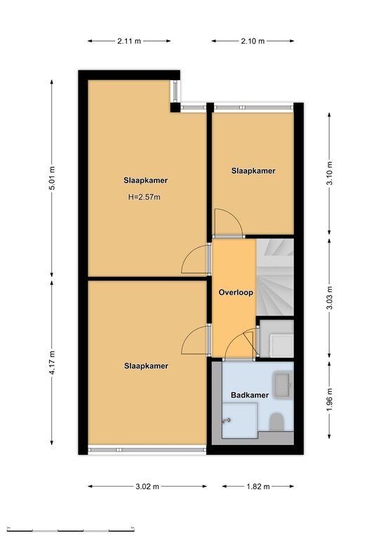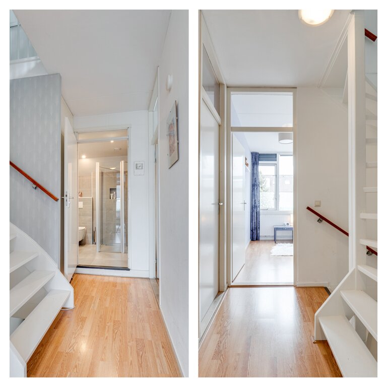 1e Verdieping: overloop en trapopgang naar de 2e verdieping; praktische ruimte met een aansluiting voor wasmachine- en drogeropstelling; slaapkamer aan de voorzijde; nette badkamer met douche. 2e toilet en wastafel; twee slaapkamers aan de achterzijde.