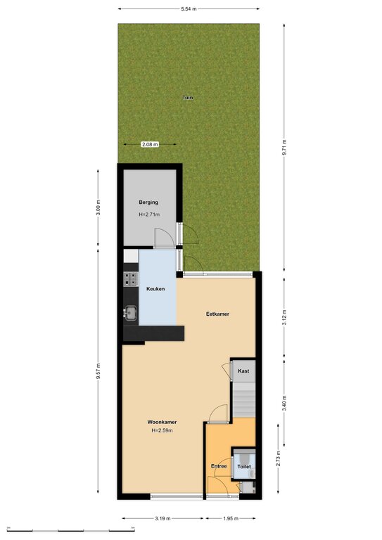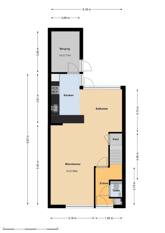 Begane grond: entree/gang, trapopgang en toilet met fonteintje; ruime woonkamer met open keuken voorzien van inbouwapparatuur; via de open keuken is de praktische aangrenzende berging toegankelijk. De achtertuin (met achterom) is zowel via de woonkamer als de berging bereikbaar.