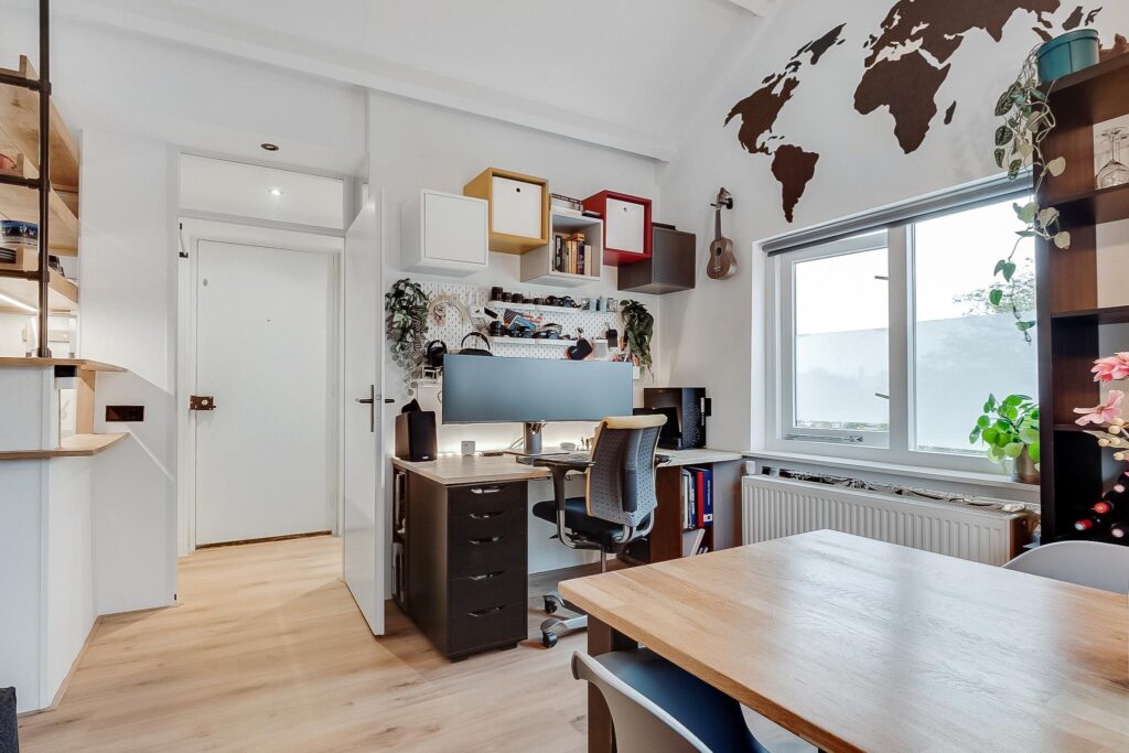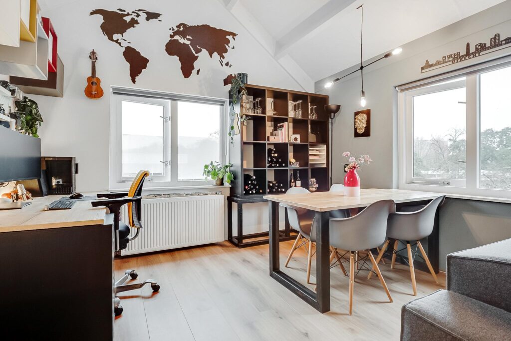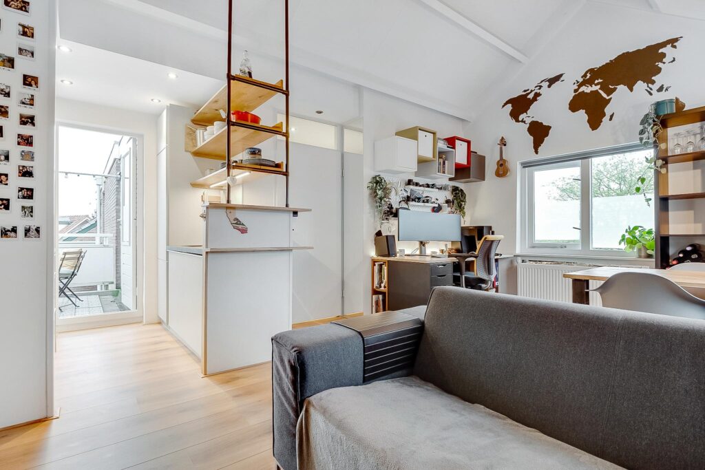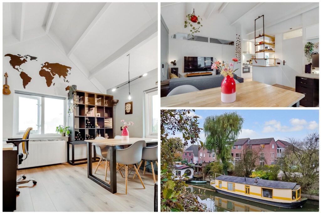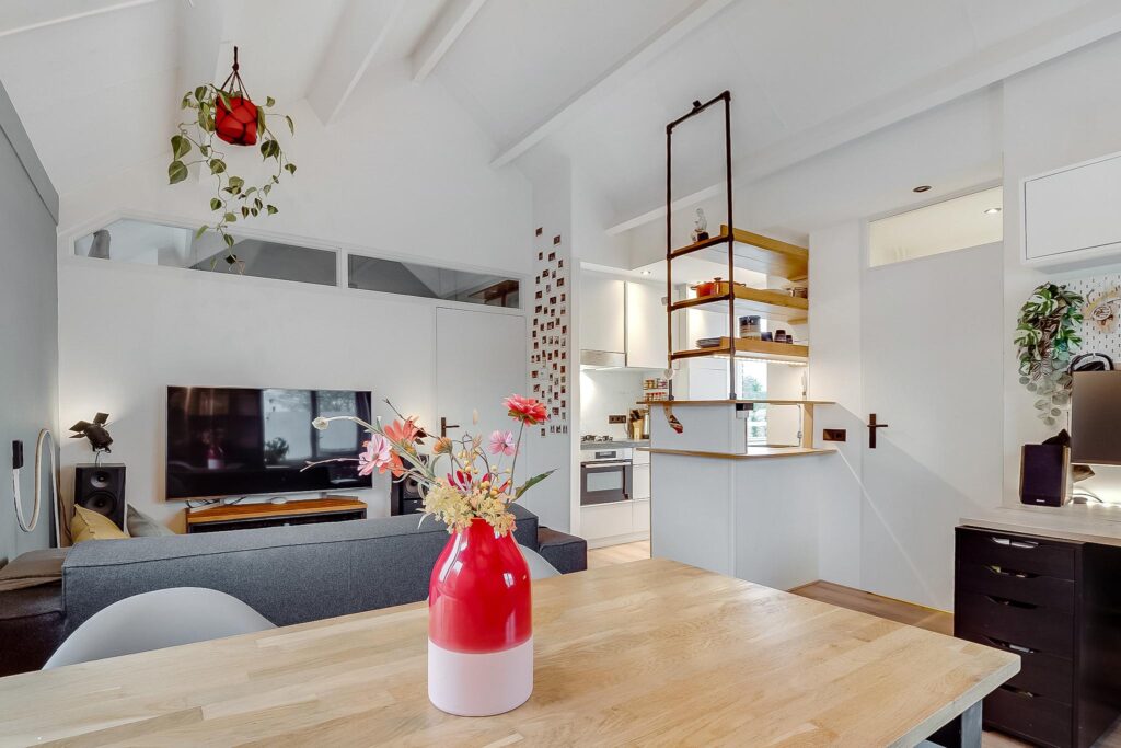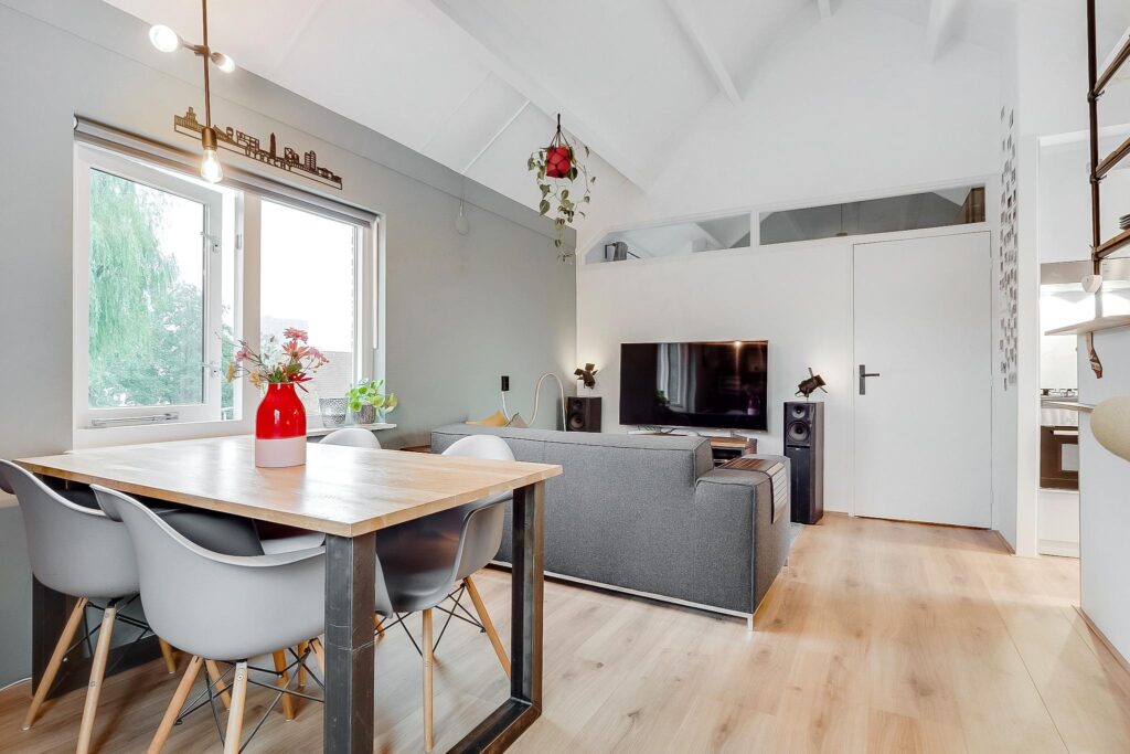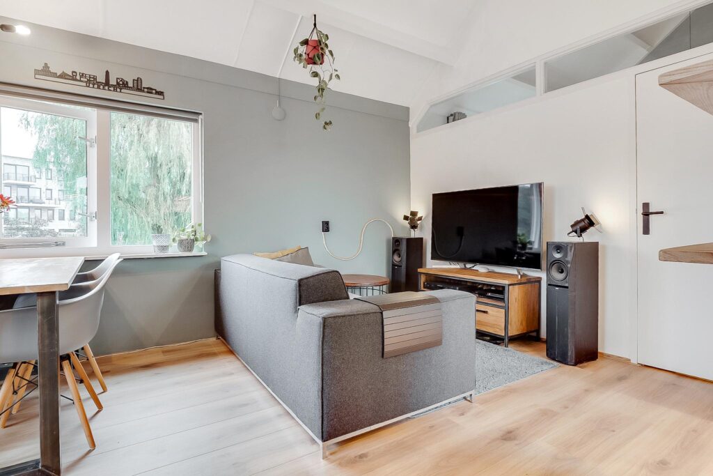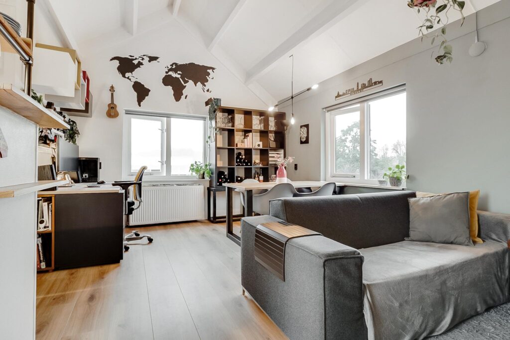 Tweede verdieping: bij binnenkomst in de hal vind je de meterkast en een moderne toiletruimte met fonteintje. De ruime woonkamer heeft een indrukwekkende nokhoogte van ca. 3,92 meter, wat zorgt voor een gevoel van licht en ruimte. Vanuit de woonkamer is er prachtig uitzicht over de Vecht.