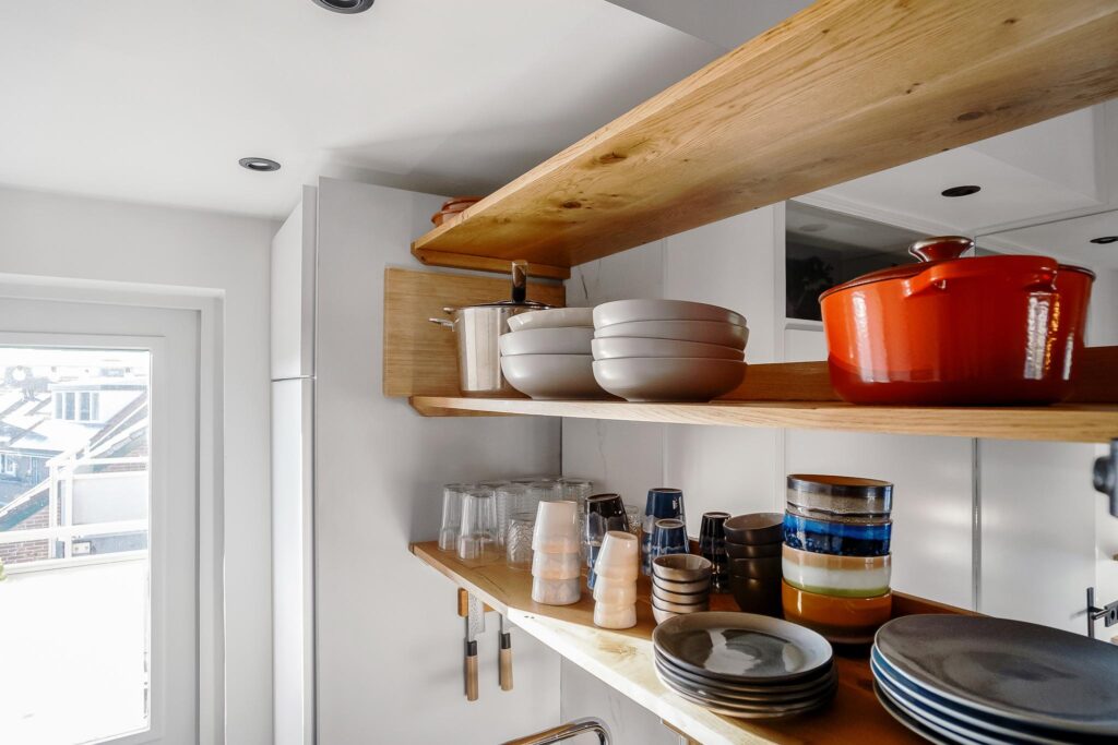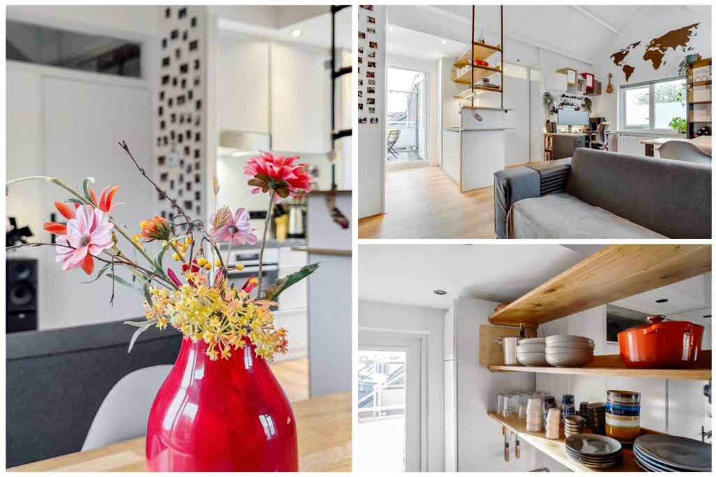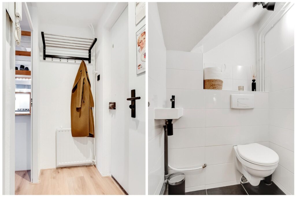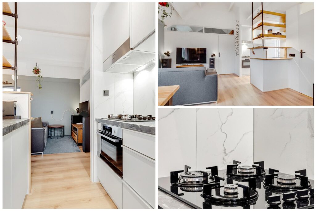 De moderne open keuken is uitgerust met hoogwaardige inbouwapparatuur van Bosch en heeft een stijlvolle massief eikenhouten bar. De keuken is voorzien van een koel/vriescombinatie, 4-pits gaskookplaat, ingebouwde afzuigkap, combimagnetron met stoomfunctie en een vaatwasser. Vanuit de keuken is er toegang tot het zonnige balkon, waar je kunt genieten van een prachtig uitzicht op de Dom.