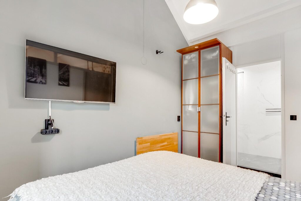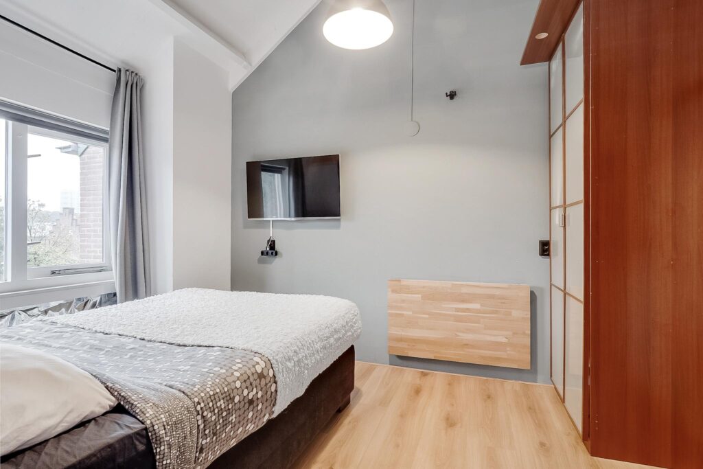 De ruime slaapkamer is via de woonkamer te bereiken en leidt naar de moderne badkamer. Deze is van alle gemakken voorzien: een regendouche, stijlvol wastafelmeubel met spiegelverwarming, inbouwkast en mechanische ventilatie voor extra comfort.