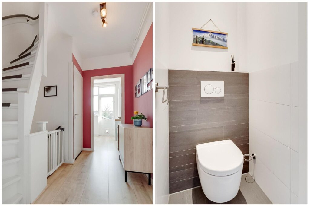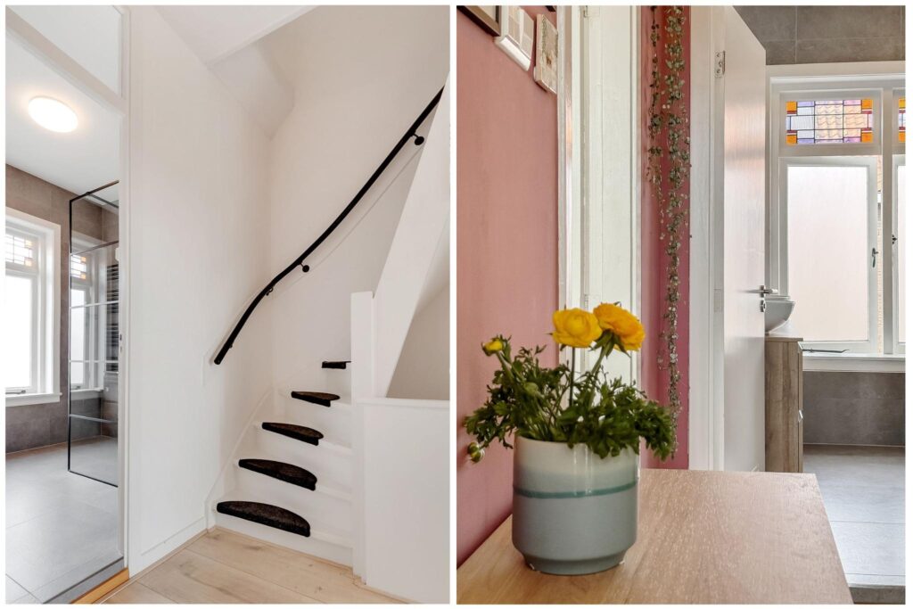 Begane grond: entree en trapopgang. De hal is extra breed, ideaal voor het stallen van fiets(en).