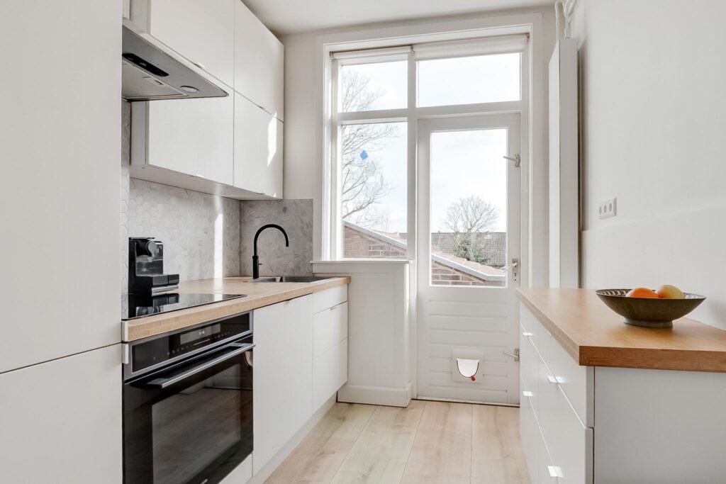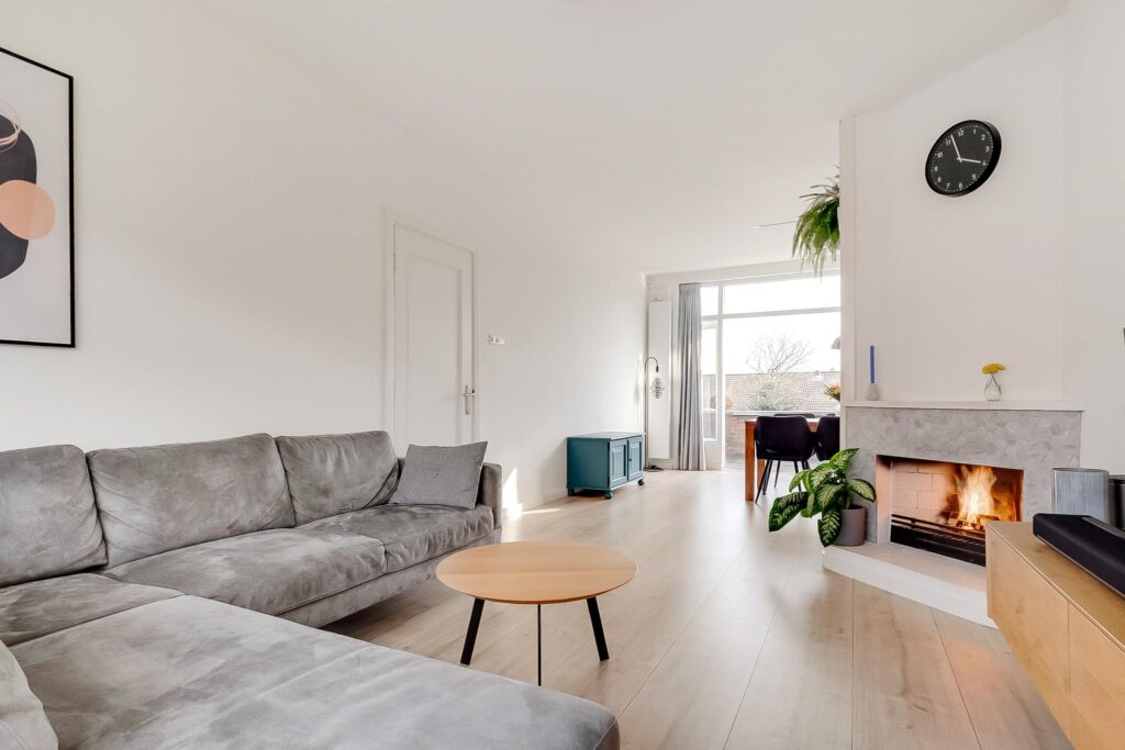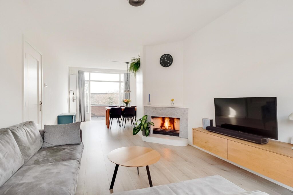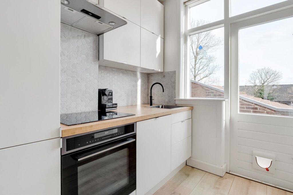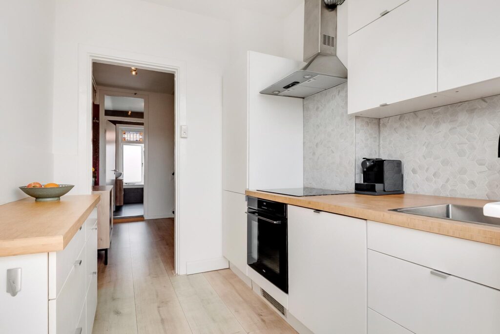 Dichte keuken met onder andere een inductiekookplaat en een Quooker. Vanuit de keuken is er toegang naar het zonnige balkon op het zuiden. Sfeervolle en lichte woonkamer met sierhaard en openslaande deuren naar het balkon.