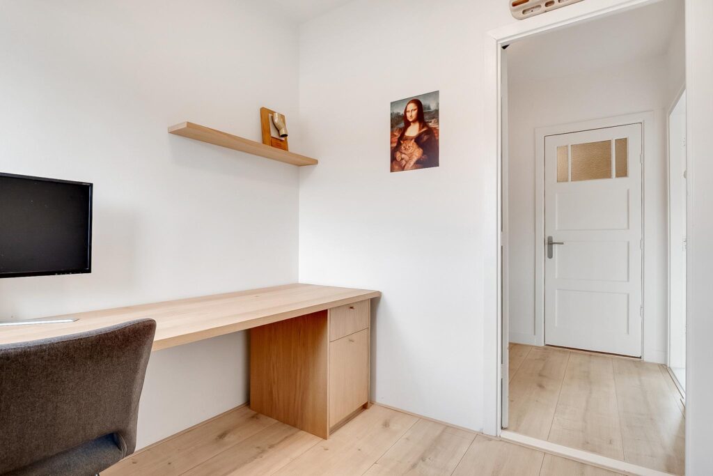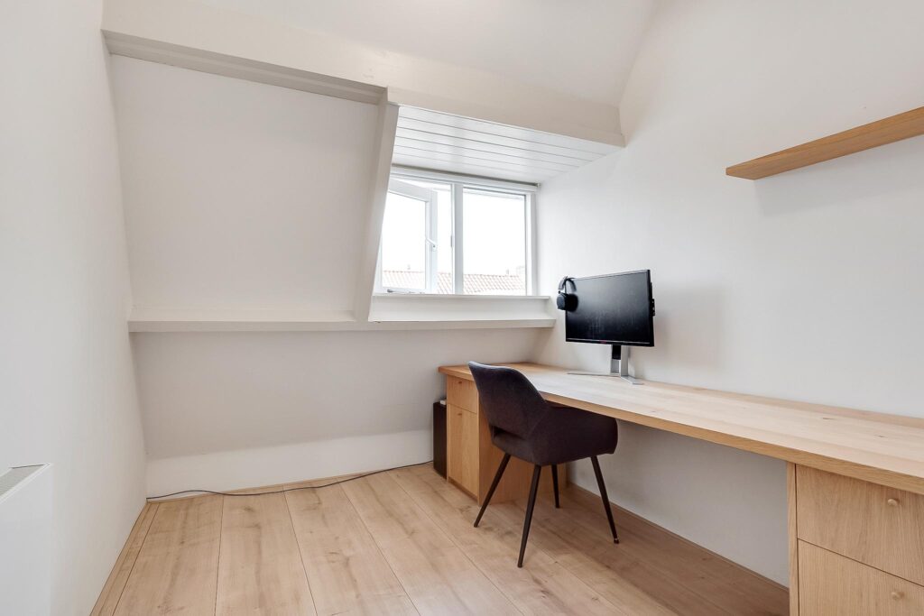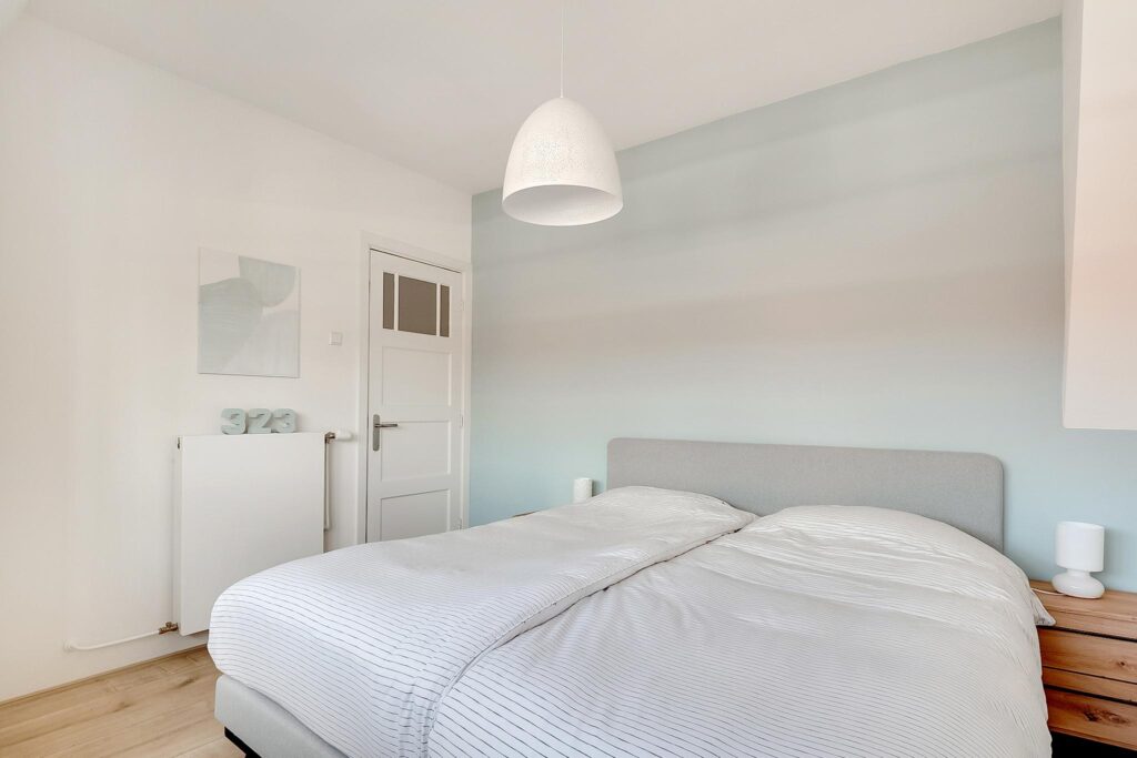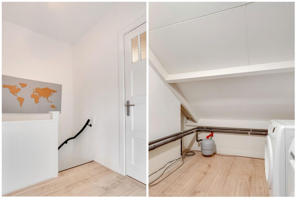 Tweede verdieping: overloop met toegang tot drie slaapkamers. Twee slaapkamers aan de voorzijde, waarvan één met vaste kast en bergruimte. Derde slaapkamer aan de achterzijde. Wasruimte/berging met de opstelling voor de cv-combiketel (2021) en aansluiting voor de wasmachine.