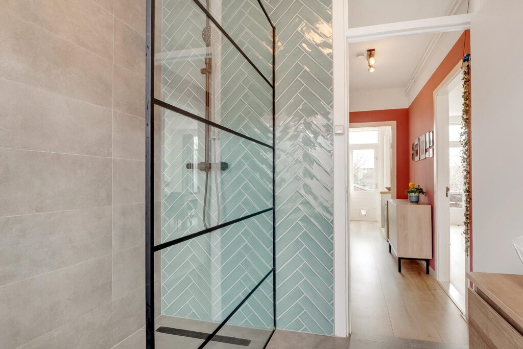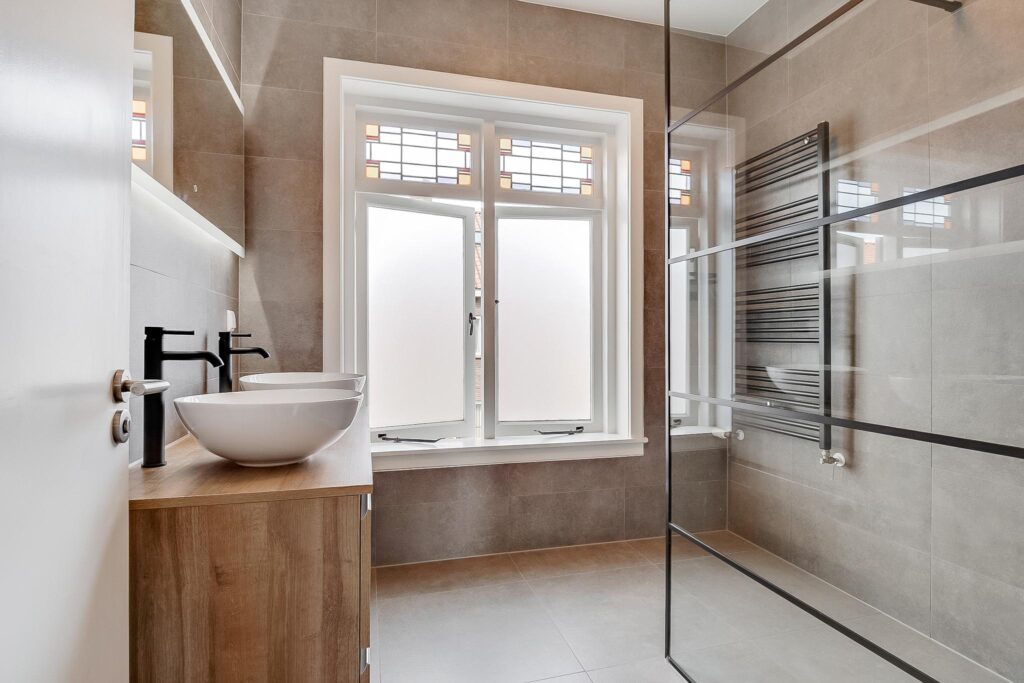 Ruime badkamer (vernieuwd in 2021) voorzien van een douche en dubbele wastafel.