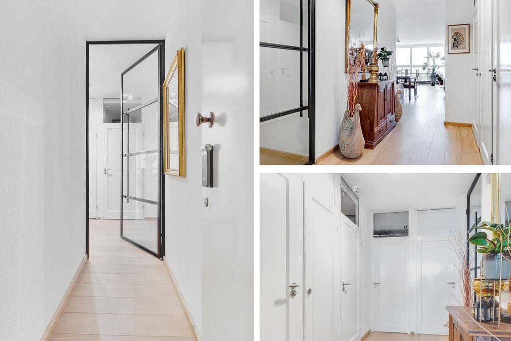 Lift naar corridor. Aan de ruime corridor is toegang naar de eigen berging en via een trapopgang (twee trappen) is de entree naar het appartement te bereiken.