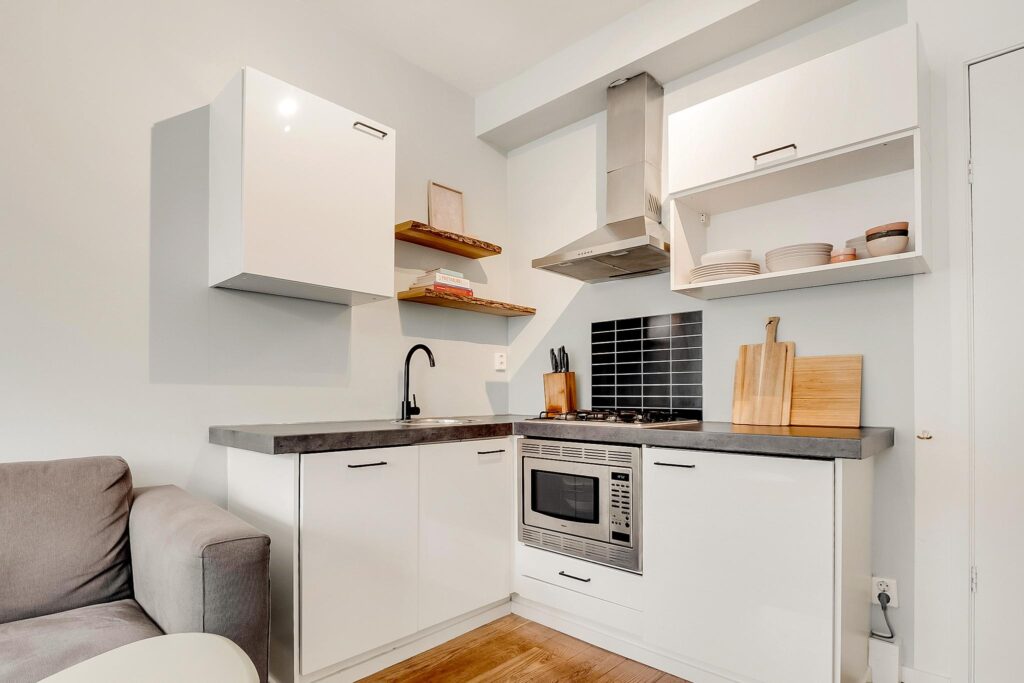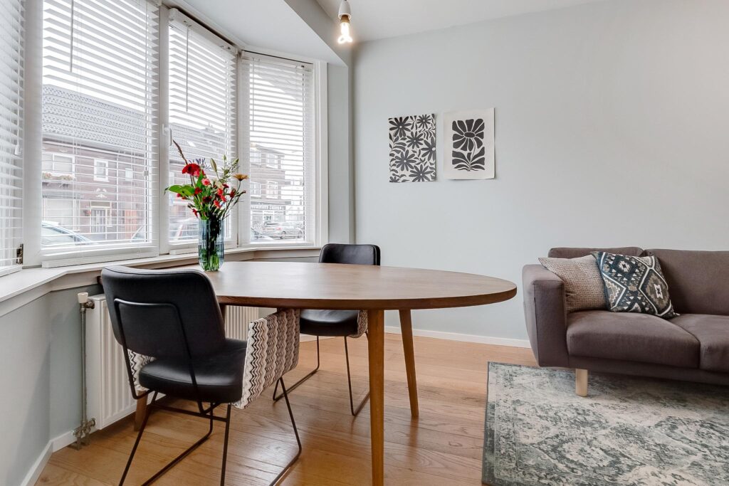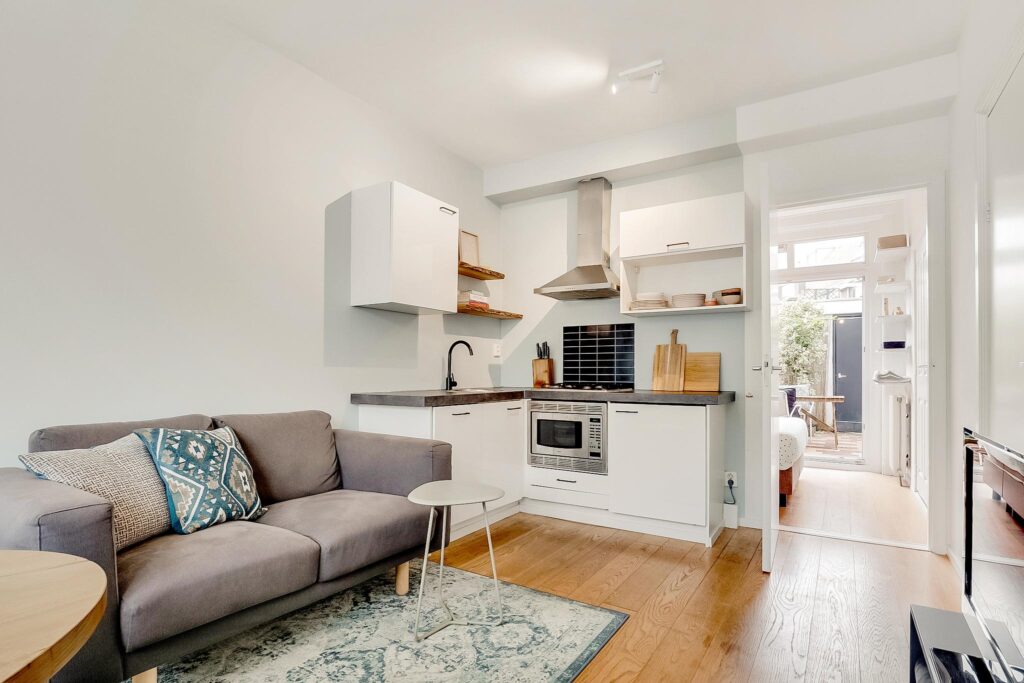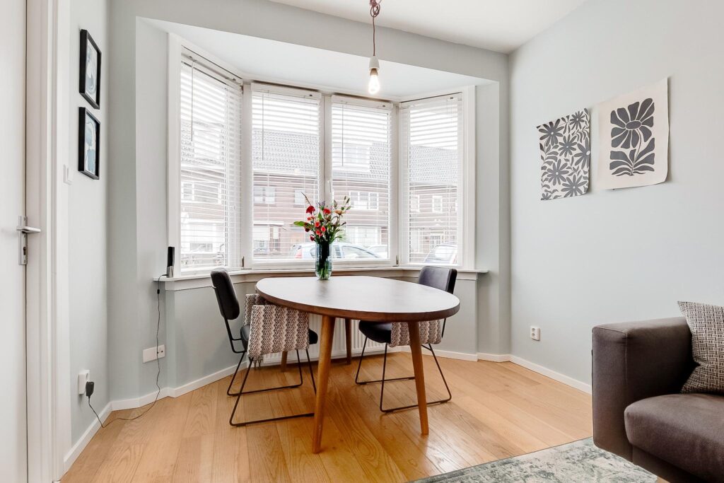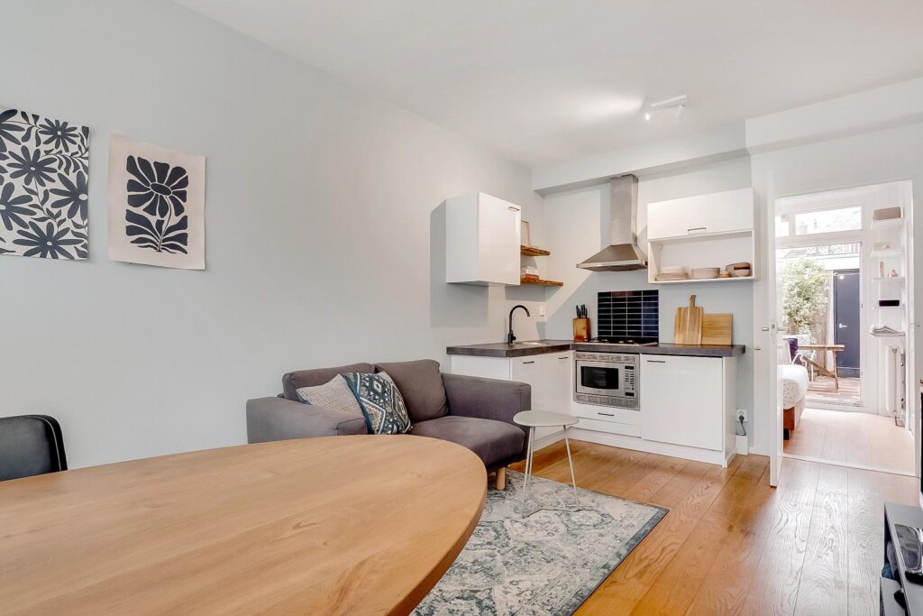 Aan de straatzijde ligt de lichte, sfeervolle woonkamer met authentieke erker. De moderne open keuken is uitgerust met inbouwapparatuur, waaronder een vaatwasser, 4-pits fornuis, koel-vriescombinatie en combimagnetron. Een ruime trapkast met veel opbergruimte, geschikt voor een wasmachine, zorgt voor extra gemak.