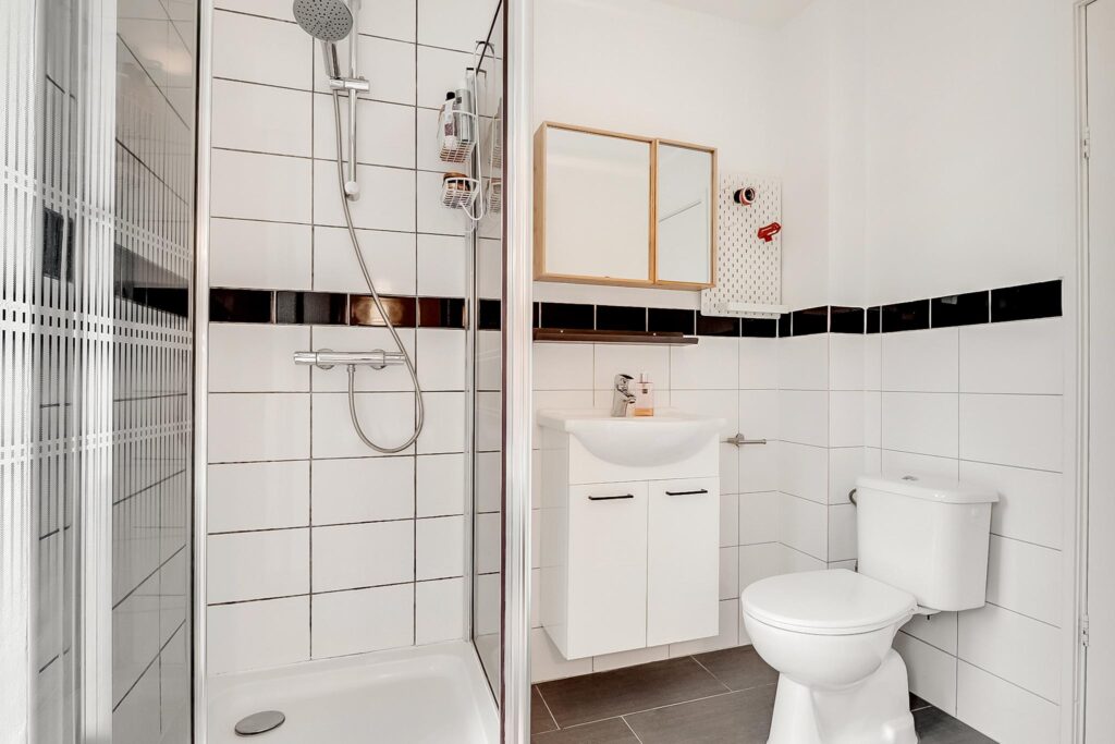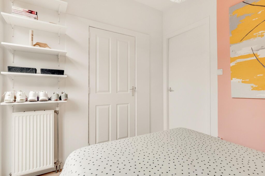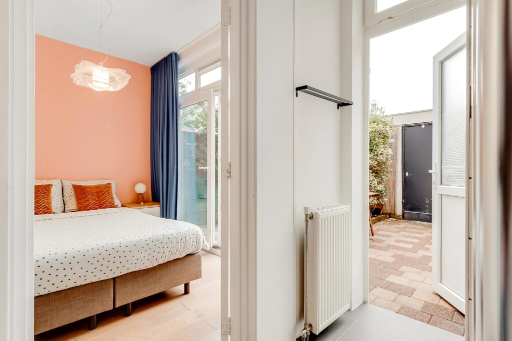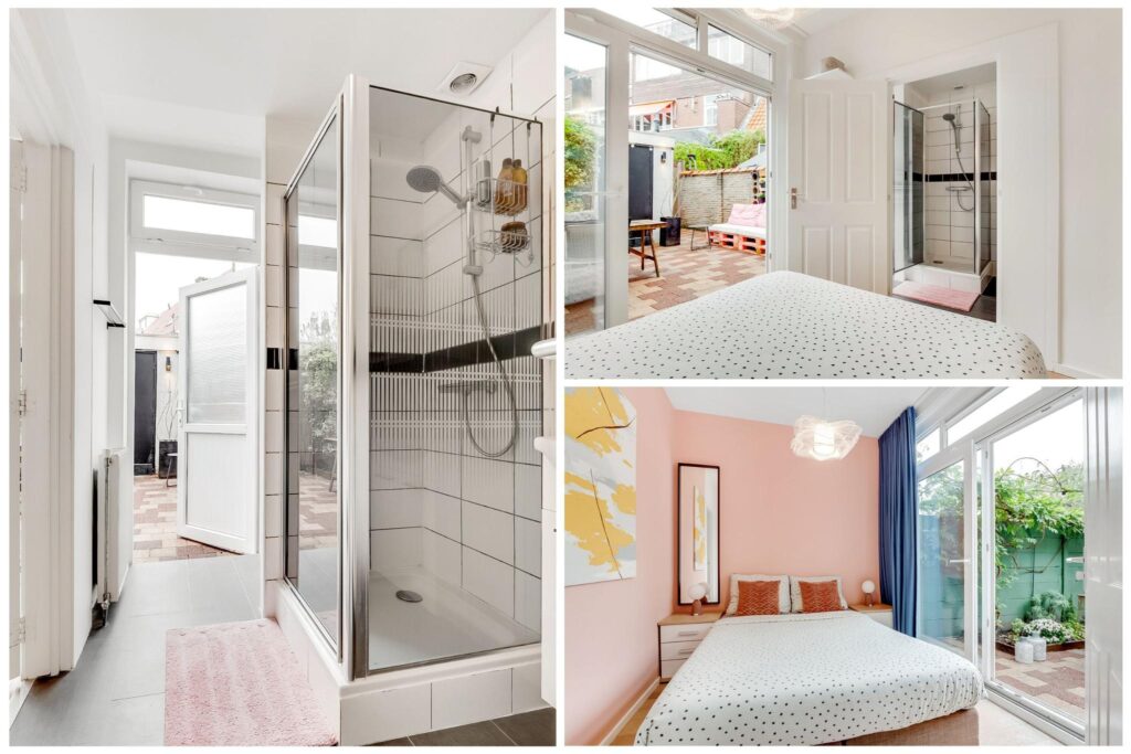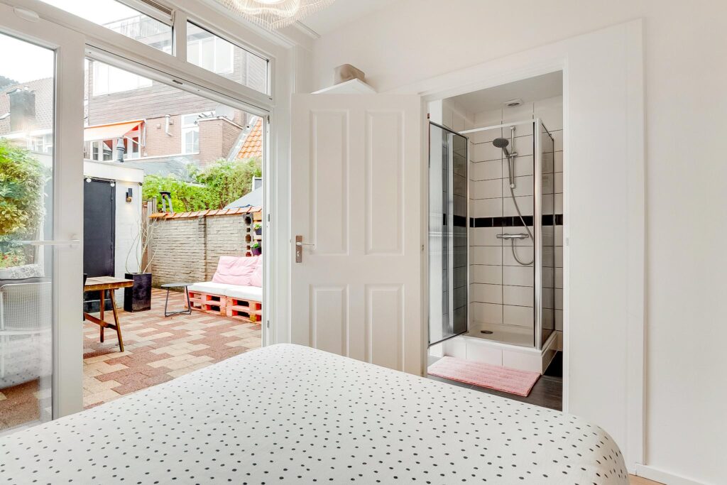 De ruime slaapkamer bevindt zich aan de achterzijde van de woning en biedt directe toegang tot de moderne badkamer met douche, wastafel en toilet. Hier is ook een handige bergkast voor extra opbergruimte.