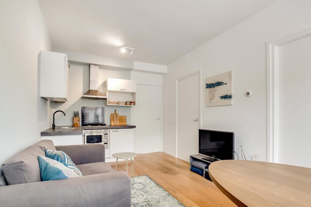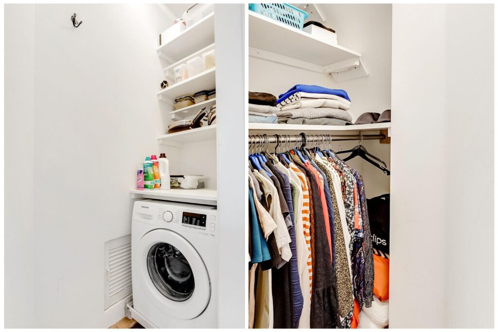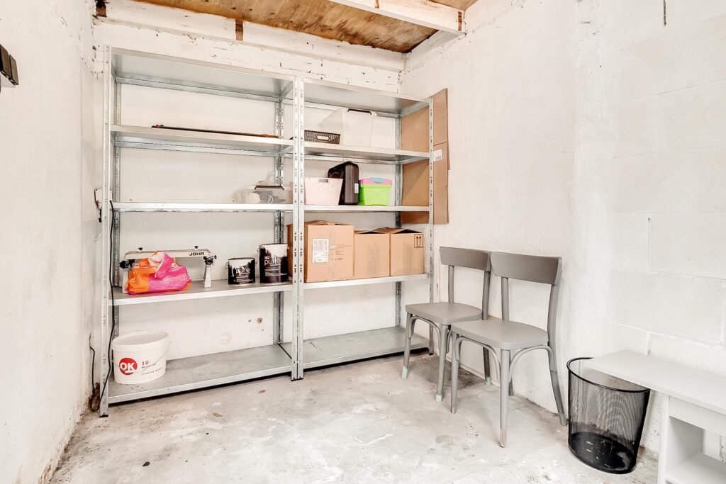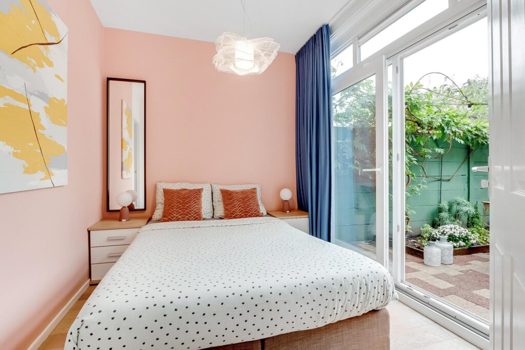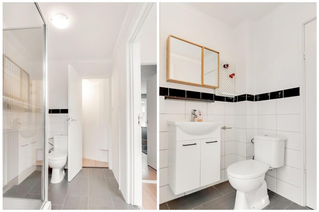 De ruime slaapkamer bevindt zich aan de achterzijde van de woning en biedt directe toegang tot de moderne badkamer met douche, wastafel en toilet. Hier is ook een handige bergkast voor extra opbergruimte.