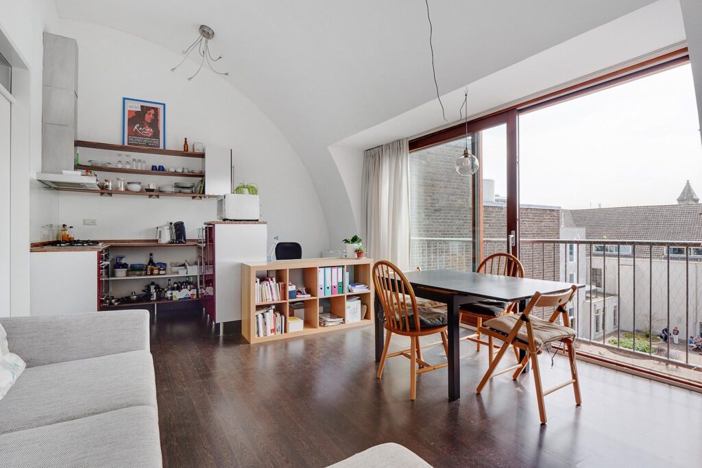 3e verdieping: eigen entree/gang, toilet, kast met CV-opstelling; badkamer met douche en wastafel. Ruime woonkamer met open u-vormige keuken met 5 pits gasfornuis , schuifpui met Frans balkon en vrij uitzicht op het binnenterrein. Slaapkamer met Frans balkon. Het gehele appartement is v.v. laminaatvloer. Mooi en ruimtelijk detail van de woonkamer en slaapkamer is het hoge en halfronde gestucte plafond onder het cilindervormige dak.