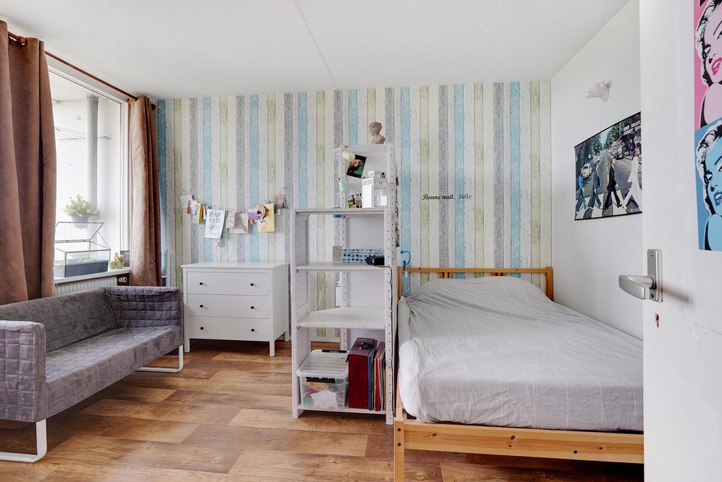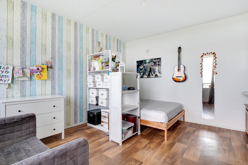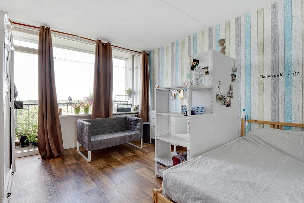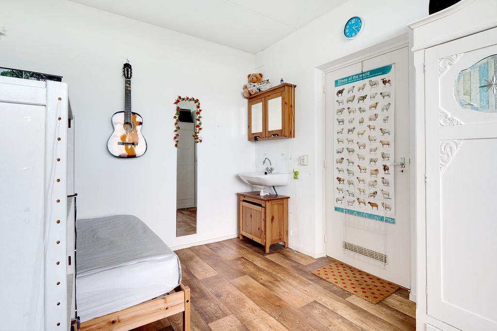 De slaapkamer is gelegen aan de andere zijde van de woning en is voorzien van een wastafel. Vanuit de slaapkamer is er toegang naar het balkon. Het balkon is gelegen op het zuidwesten met mooi en vrij uitzicht. De badkamer is voorzien van een toilet en douche.